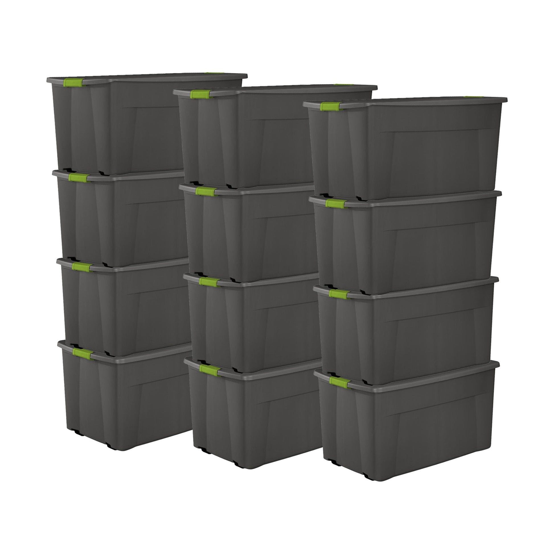 Instantly organize any space in your home, office, or workshop with this 12-Pack of Sterilite 45-Gallon Plastic Stackable Storage Tote with Lid and Wheels in Grey.