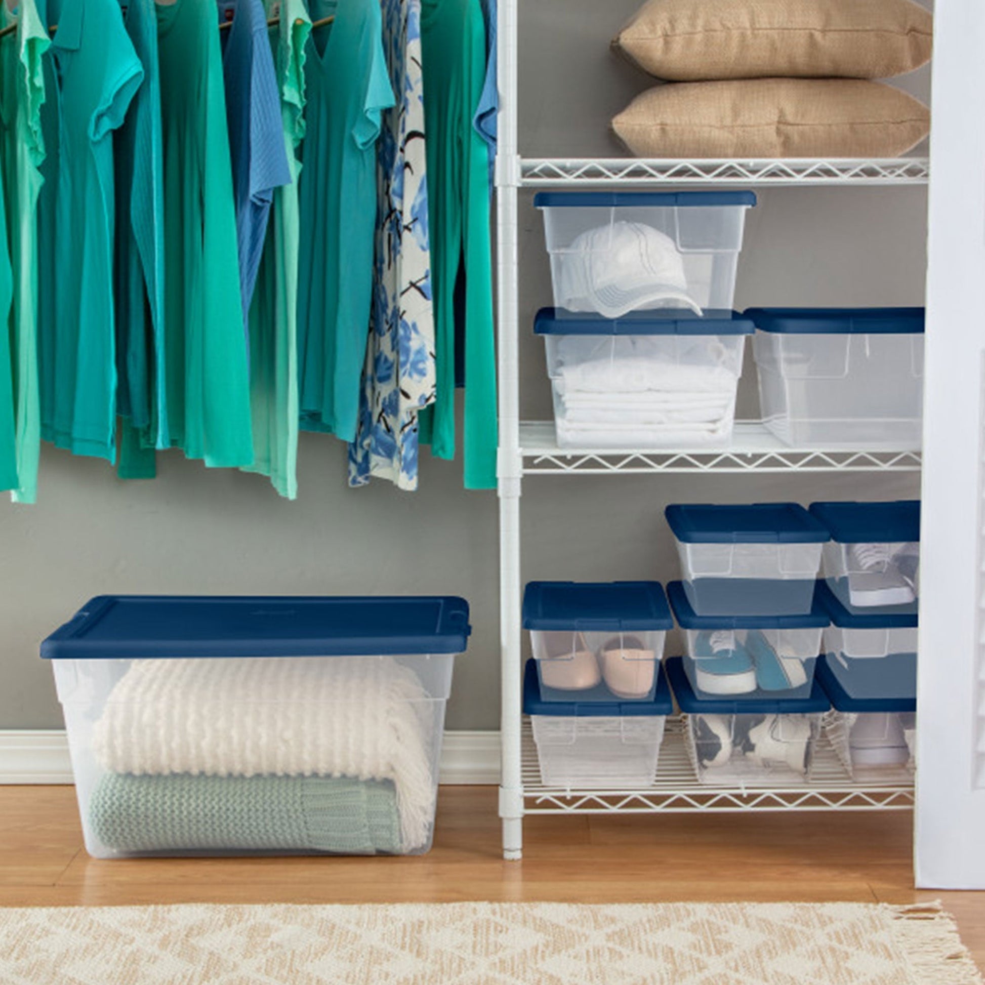 With 56 quarts of interior space, the box is perfect for holding bulky and large objects. Blankets, towels, seasonal decorations, clothing, games, and other items fit neatly inside, letting you store them away without hassle. Clear sides do not hide the box's contents for easy identification so you don't have to open every box to find what you're looking for.