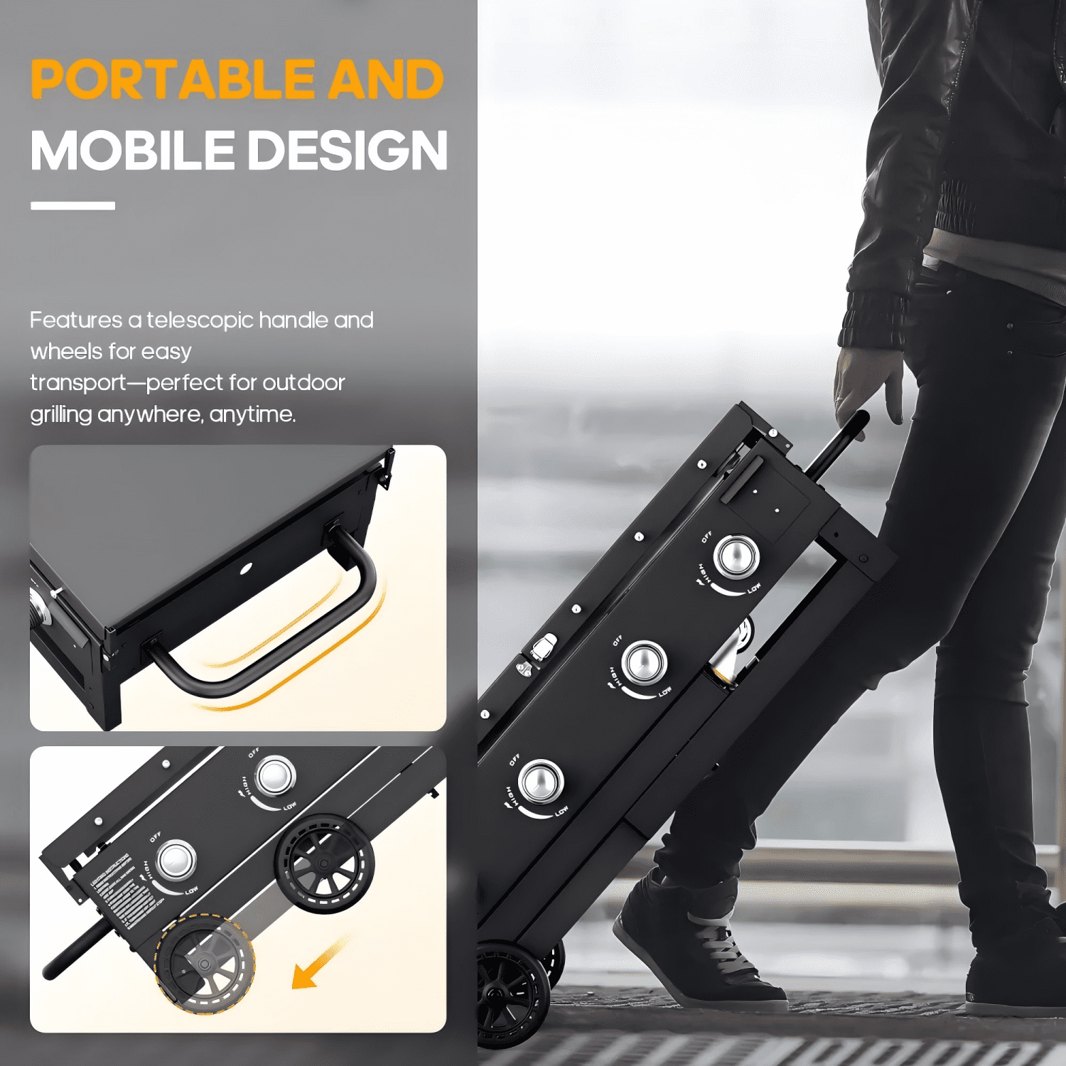 This family-friendly portable gas grill is a must-have for any BBQ enthusiast. Boasting 60,000 BTUs, it heats up quickly and efficiently, with four control knobs to adjust the temperature of each of the four individual burners. The handle design makes it easy to put on and take off the griddle plate, while the waste oil cup collects waste oil and the grease catch pan prevents oil from dropping. The cylinder holder base provides a secure place for your gas cylinder, and its versatile cooking capabilities allow you to cook a range of foods including eggs, pancakes, bacon, steak, and potatoes. It's ideal for use on your patio, in your garden, or in your backyard. Assembly is made easy with the clear instructions provided, and the smooth surface ensures effortless cleaning. Don't hesitate to order this Portable Gas Grill today!
