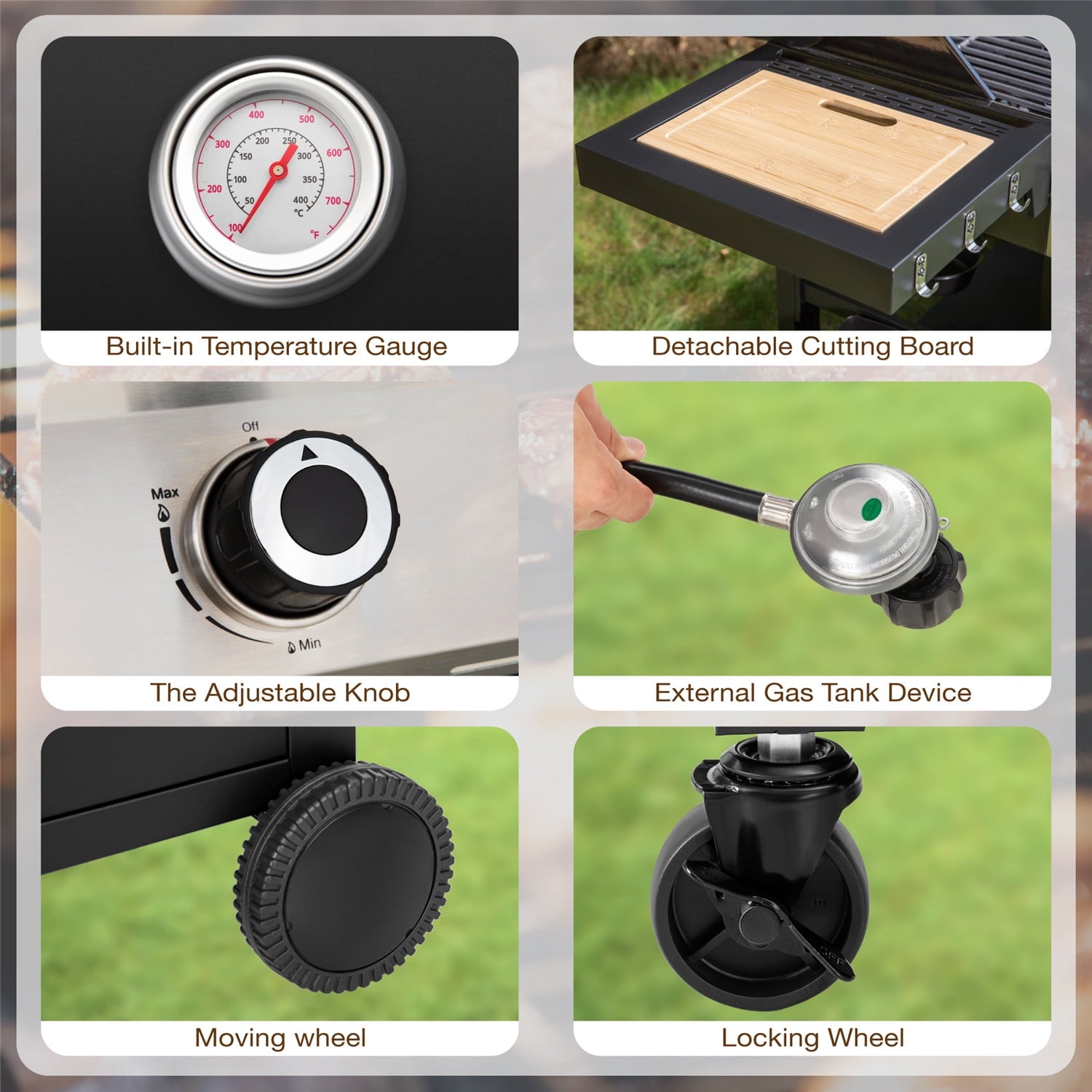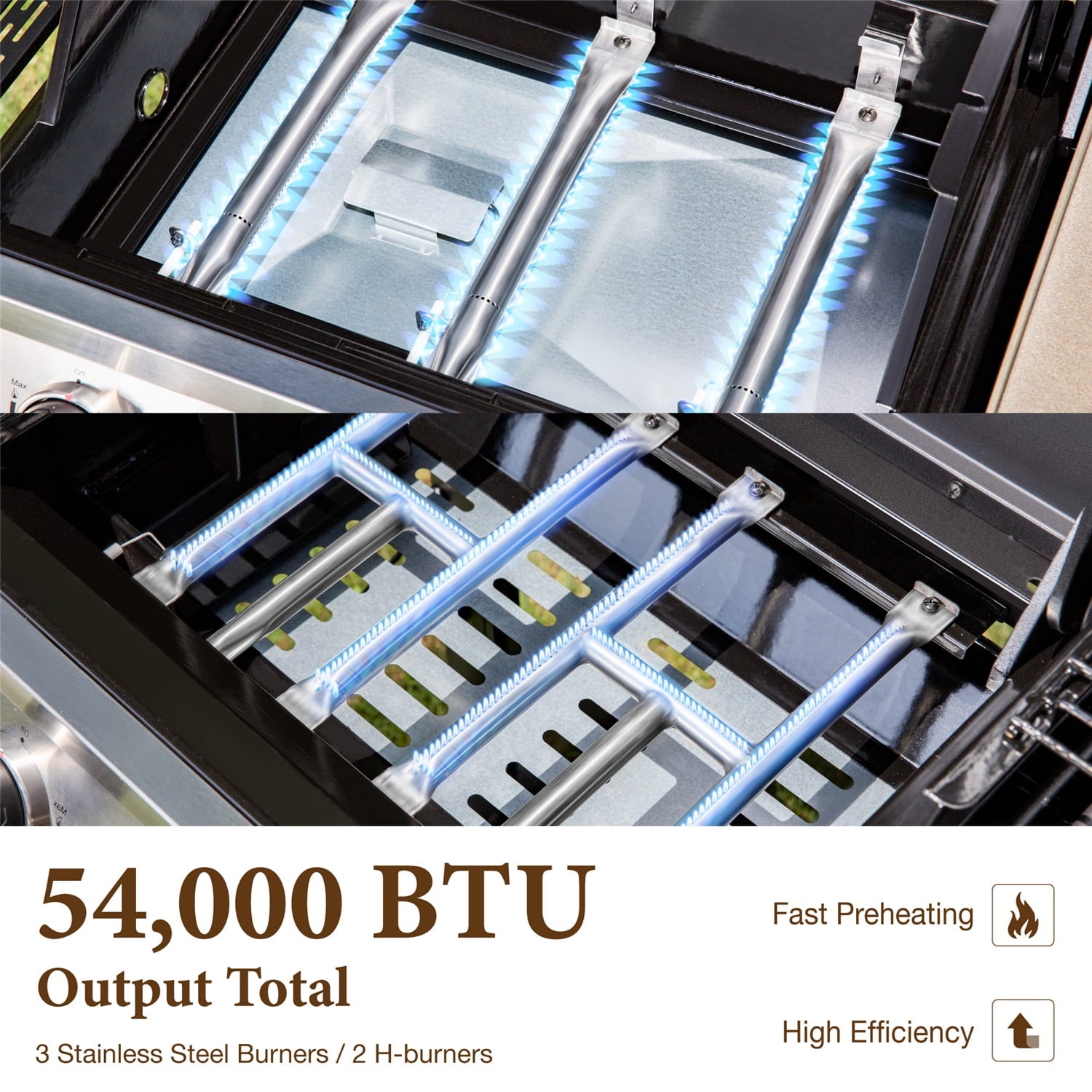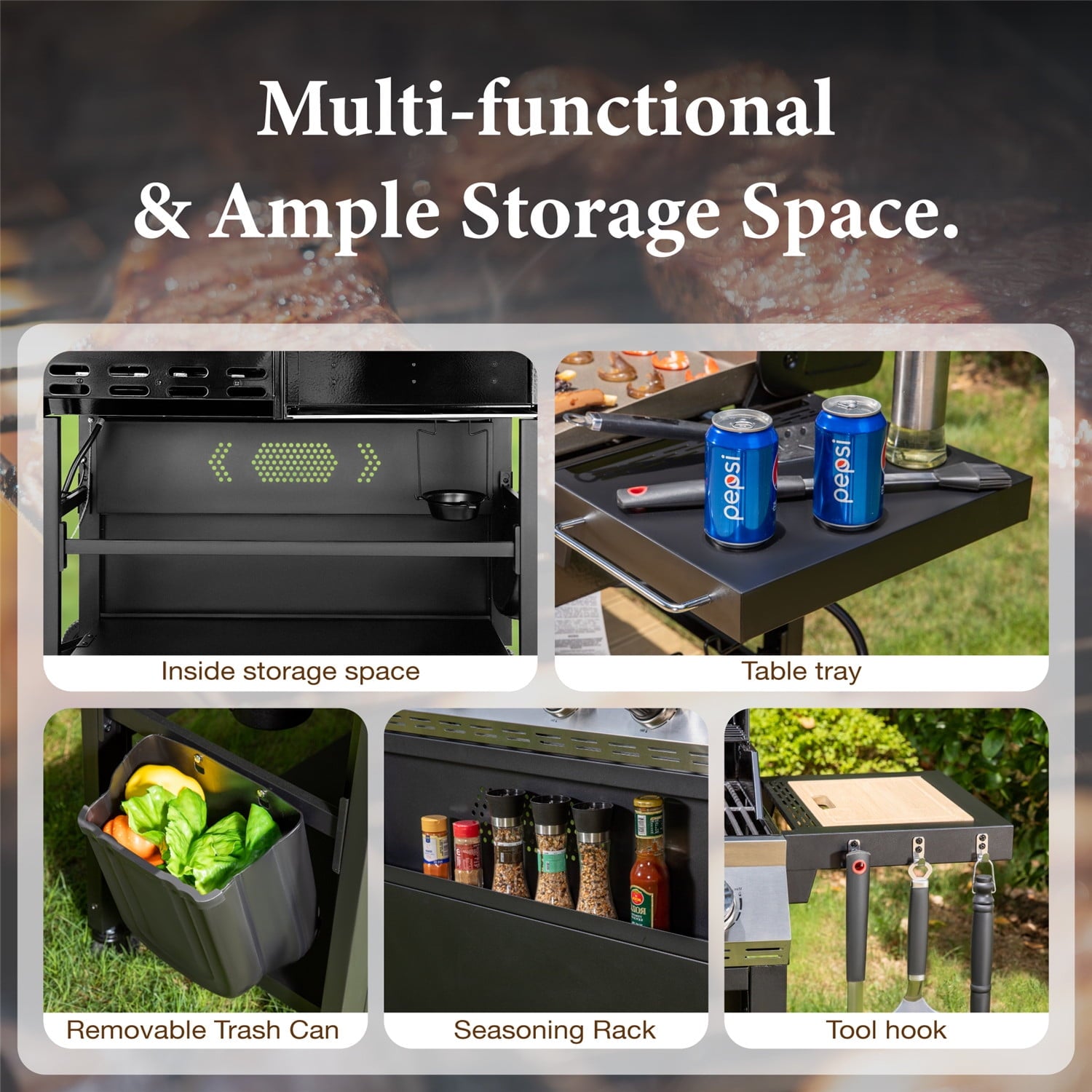 The Gas Grill and Griddle Combo offers unmatched versatility for all your outdoor cooking needs, allowing you to grill steaks, sauté vegetables, and more with ease. This BBQ grill features a super large cooking area of 696 sq. in., with 442 sq.in. of porcelain-enameled cast iron grill space and 254 sq.in. of griddle area, all independently controllable for flexible cooking options at gatherings. Cleanup is hassle-free thanks to a tilting grease tray and waste oil cup that collect excess grease. With a powerful 54,000 BTU output from parallel H-shaped stainless-steel burners for even heat distribution, this outdoor propane gas grill and griddle combo guarantees delicious results. Its updated enameled fire chamber not only enhances durability but also ensures easy maintenance, keeping your grilling experience enjoyable and stylish.