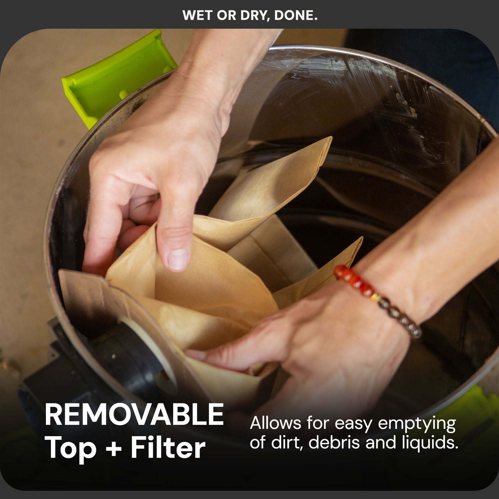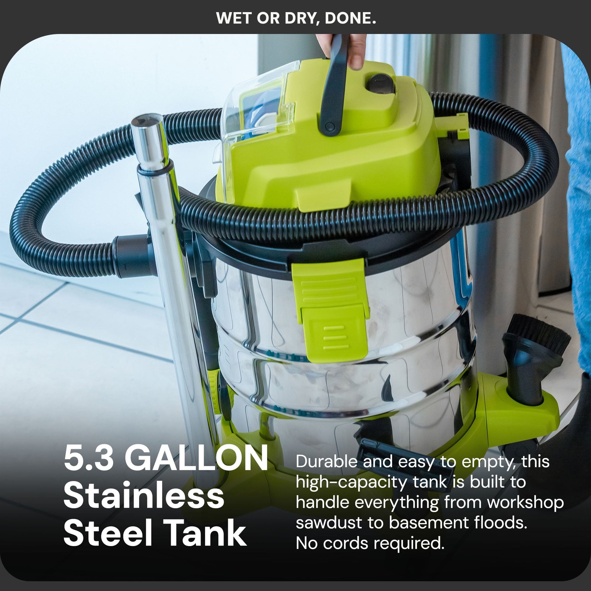 - Rugged 5.3 gallon stainless steel tank handles wet and dry messes with easy emptying after cleanup