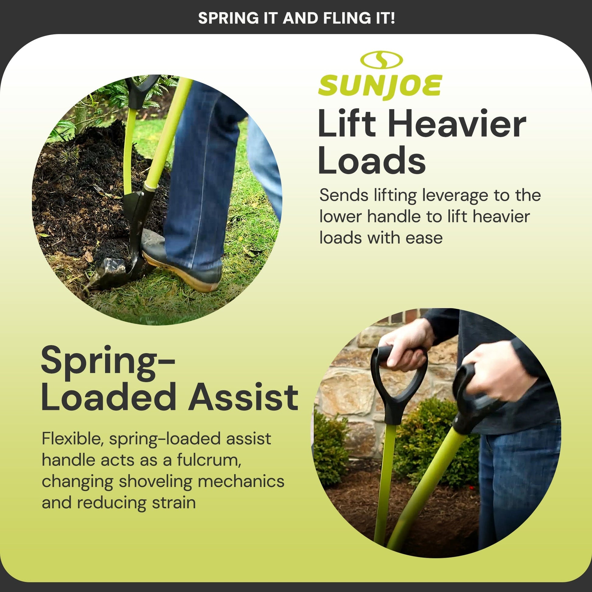 SPRING IT AND FLING IT!® Dig in - and give your back a break in the yard garden, and shovel smarter - not harder! No more heavy lifting or lower-back strain with the Sun Joe Shovelution 40” Spear Head Utility Digging Shovel. The rugged, forged steel point 9-inch blade easily pierces both sod and soil, while the ergonomically-designed spring-assist handle sends lifting leverage to the lower hand to easily lift heavy loads of dirt and mulch, or dig up shrubs, plant trees and cut trenches with minimal effort. Shovelution greatly reduces the effort, strain and potential injury involved in shoveling, using the powerful muscles of your upper body to do the lifting and throwing to reduce back strain by up to 30%, so you can lift more, and throw farther. Just spring it and fling it! SHOVELUTION captures the expended energy from throwing sod and soil, and rapidly recoils to instantly reset the shovel, ready for the next load. So, get a handle on your garden chores and Go With Joe® — and dig in with the ultimate strain-reducing shovel.