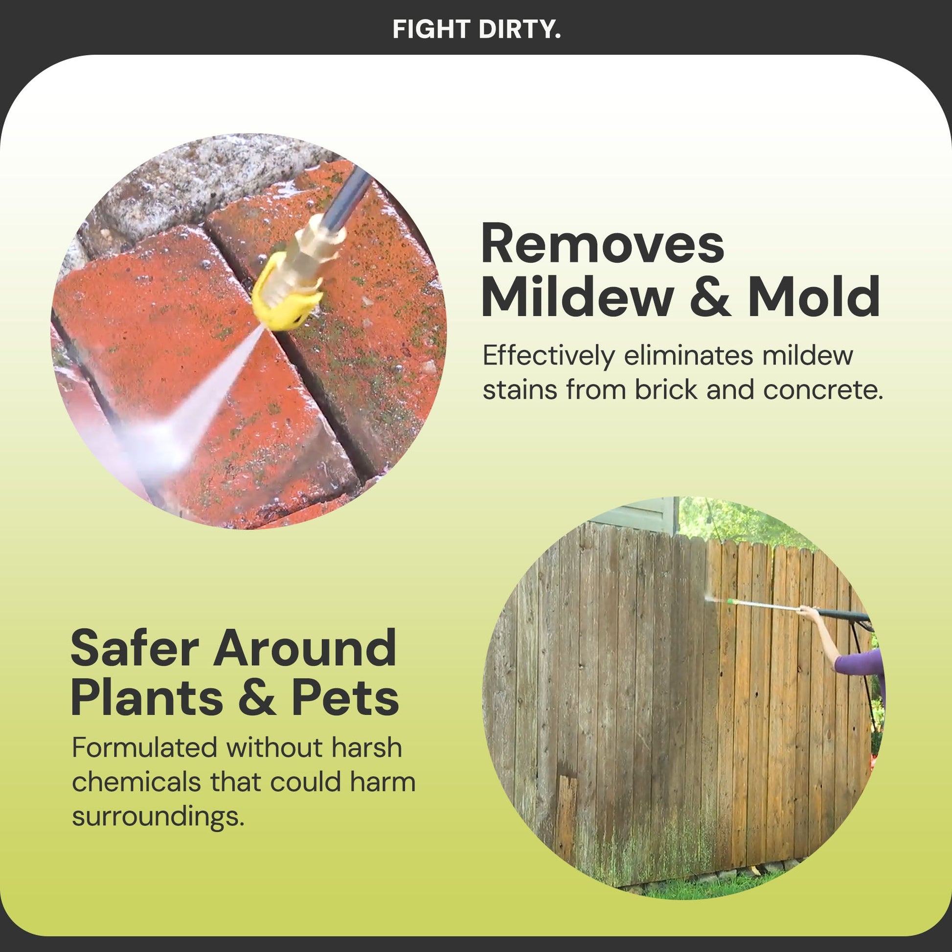 - Effectively removes dirt, grime, and mildew from various outdoor surfaces including vinyl, wood, aluminum, brick, and concrete