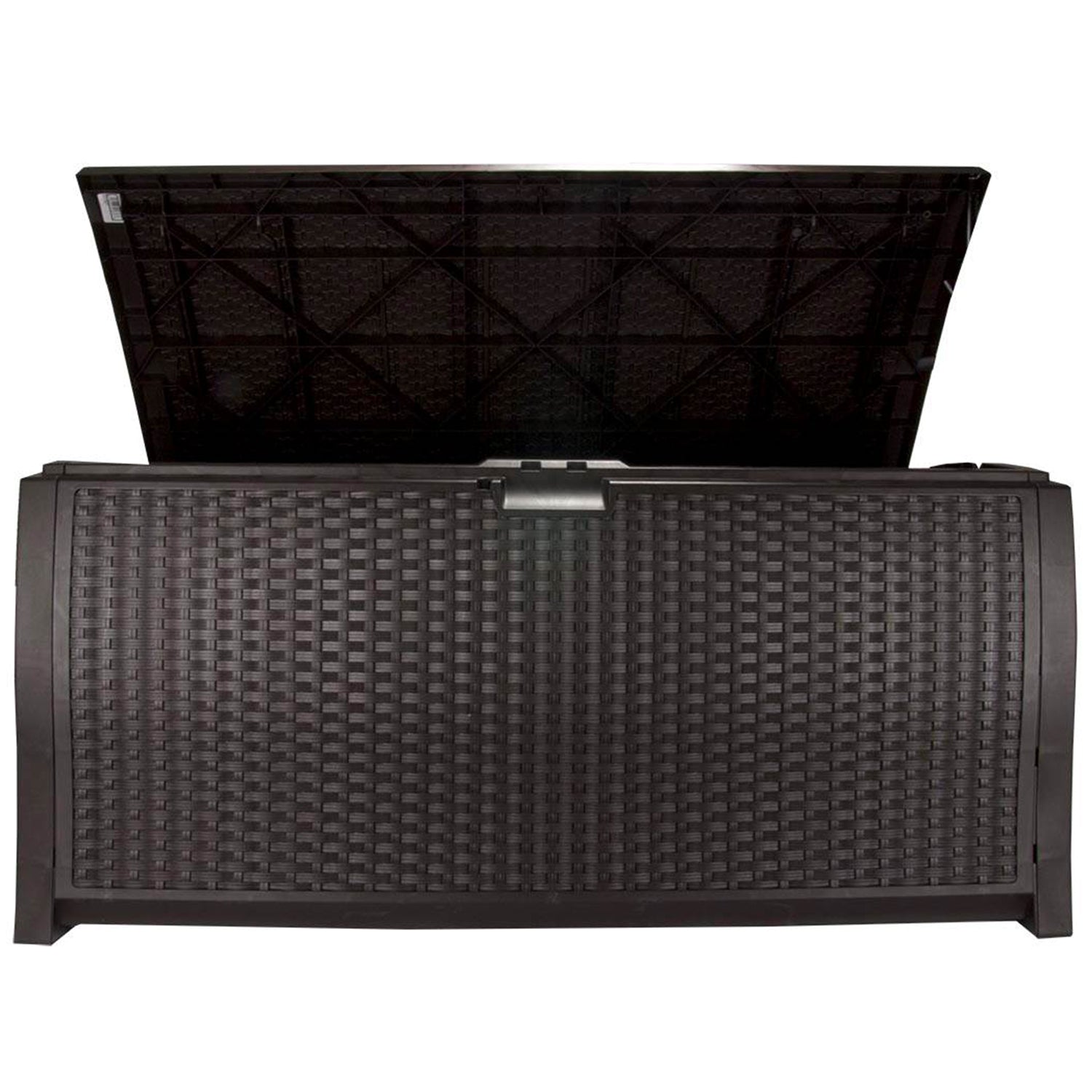 Store your gardening tools, athletic equipment and outdoor dining décor in style with this Suncast Wicker Deck Box. The Suncast 99 gallon patio deck box is ideal for storing patio accessories. Its durable construction is matched with contemporary design to bring style and harmony to any outdoor seating. Its mocha java color will be sure to complement most any pool, deck, patio, or wherever storage needs to happen.