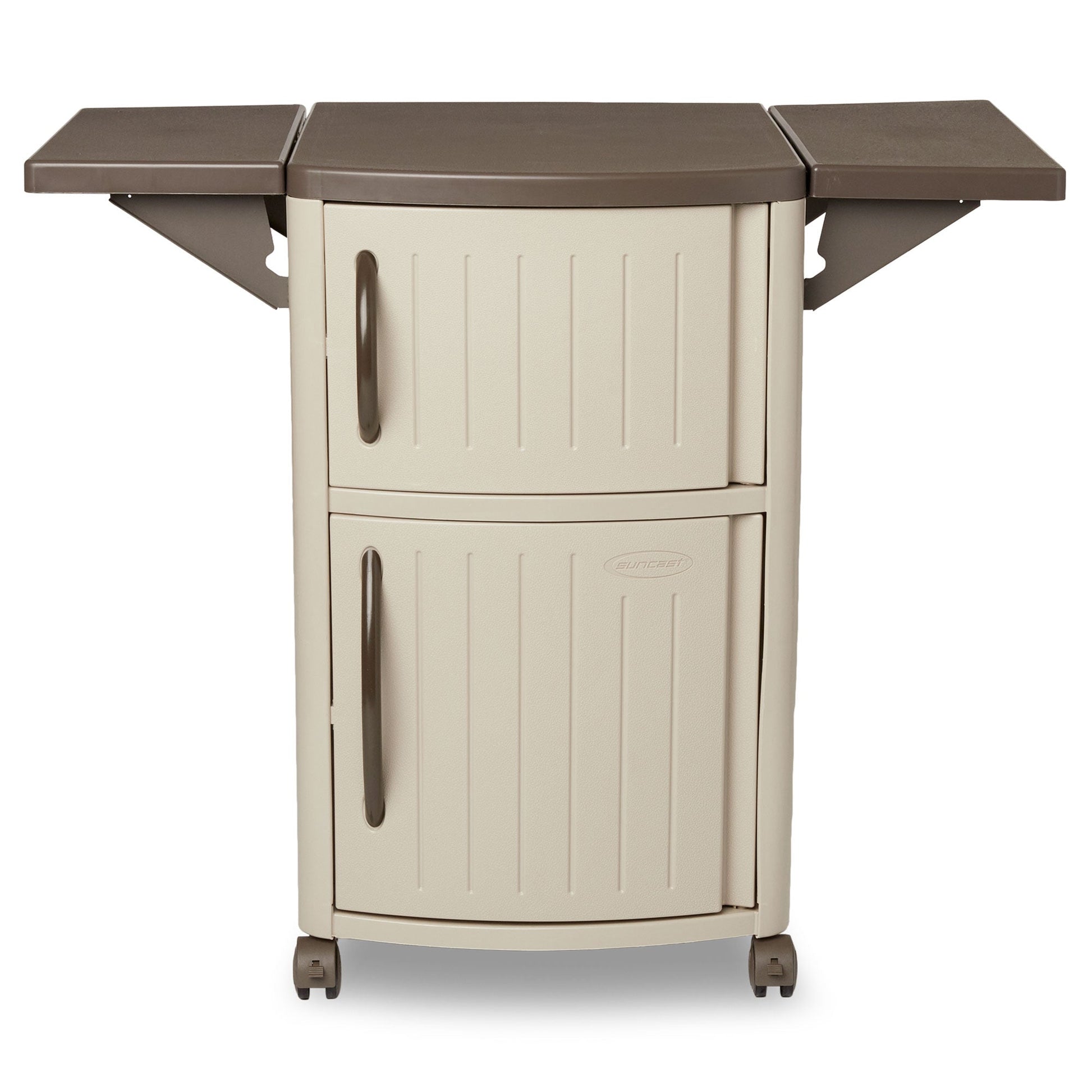 This Suncast serving station patio cabinet has a lot of space for organizing salad, drinks, napkins, condiments and other supplies required for meal preparation. It is constructed of plastic which is low maintenance and resists rust and fading from the outdoor elements. This versatile meal prep cabinet provides 40 inches of counter space with convenient drop leaf extensions for serving. The easy-gliding casters make this serving station highly portable, and the 2-wheel lock for safety when you are using the cabinet for food preparations. Upper and lower cabinets provide space for storing grilling tools or serving supplies and the included removable tray is great for both organization and entertaining.