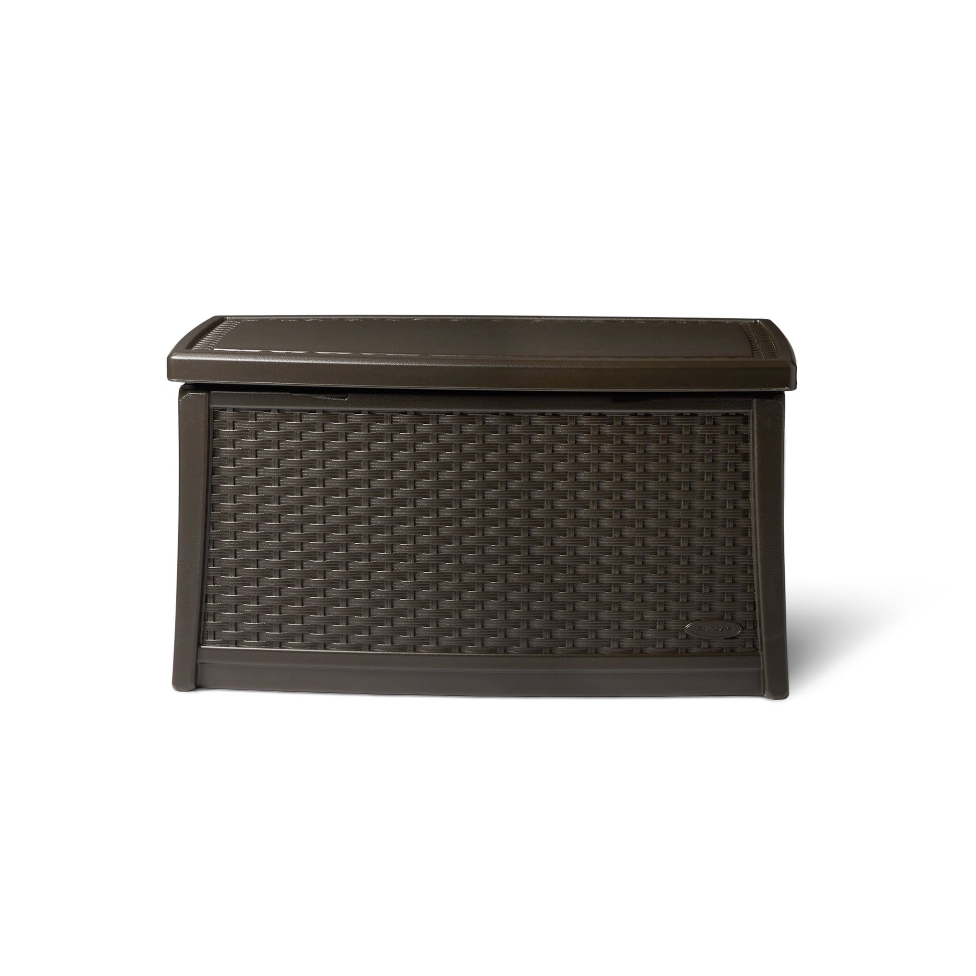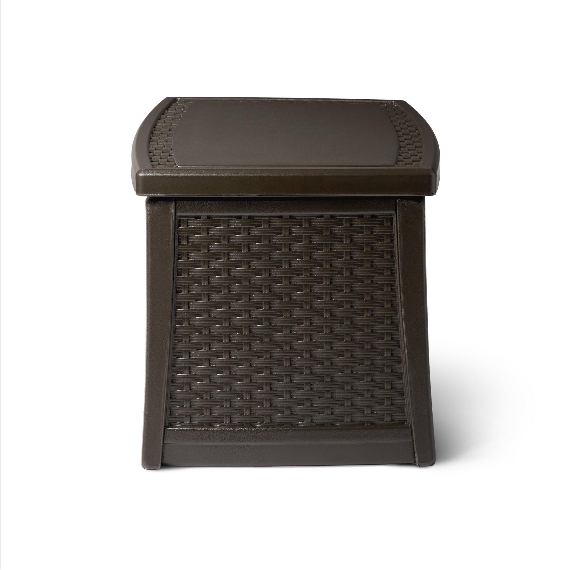 Add a splash of java and lots of storage to your patio party with this Suncast Elements Resin Wicker Coffee Table.