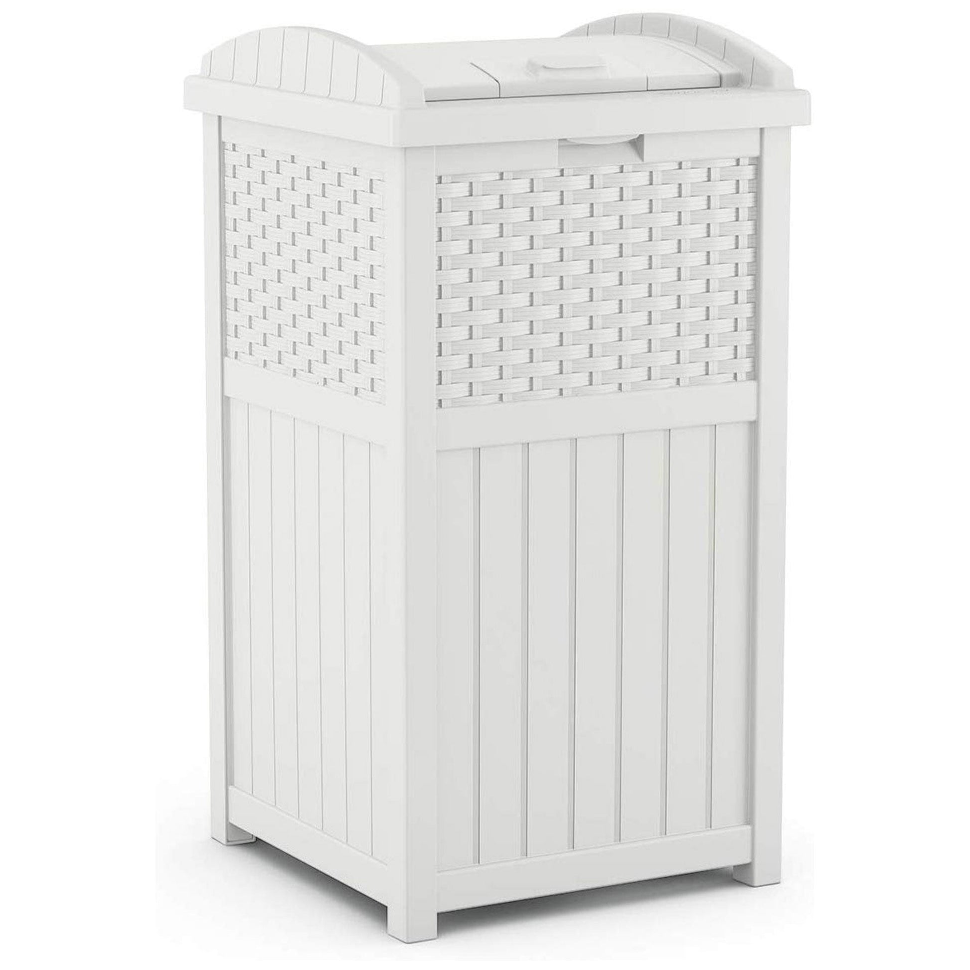 Constructed of durable material for a strong and stay-dry exterior, these hideaway trash bins can hold between 30 to 33-gallon trash bags. They feature a stylish wicker design that's not only practical but looks good too. The sturdy base won't tip over easily during storms or during periods of high wind, while the material helps keep the can dry all year long.