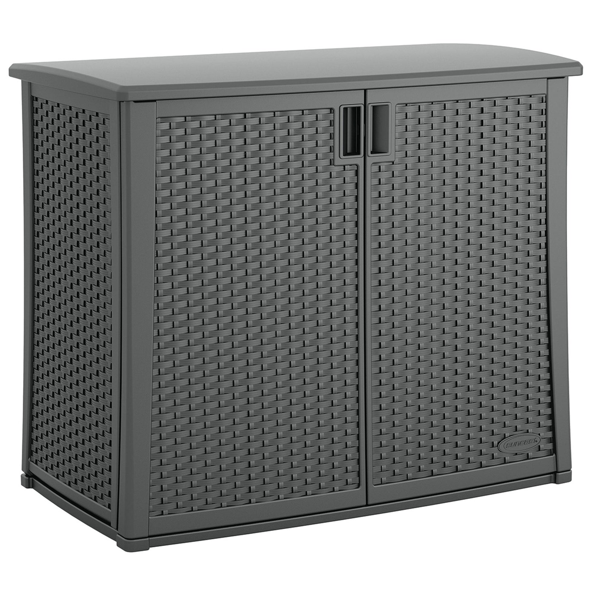 Offering a 97-gallon interior capacity, these cabinets are large enough to accommodate lawn and garden tools, grill accessories, and more. The included metal-reinforced, adjustable shelves further increase your organizational opportunities. Durable plastic construction is accented by sturdy, pad-lockable doors that provide superior strength and security (lock not included) and the wicker design looks great in any outdoor setting.