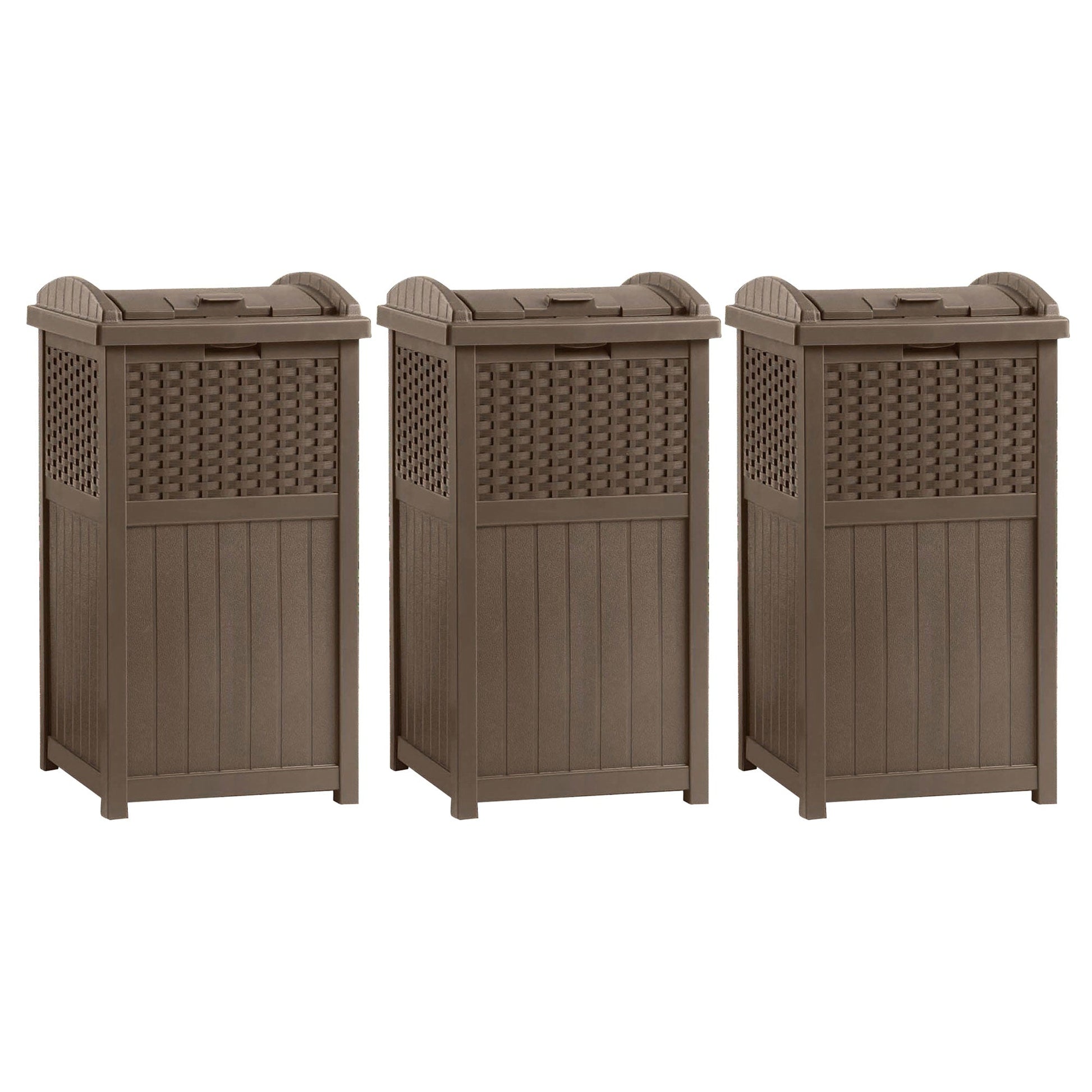 Three pack of this Suncast outdoor trash hideaway has a stylish design that looks great on most patios or decks. The wicker design compliments most any patio furniture or home decor. This Suncast outdoor trash hideaway unit includes a latching lid and has a solid bottom panel, which keeps garbage from spilling out all over the patio or deck. Standard 30-33 gallon garbage bags fit perfectly inside this Suncast trash hideaway, so it's perfect for poolside areas, patios, and decks that get lots of use.