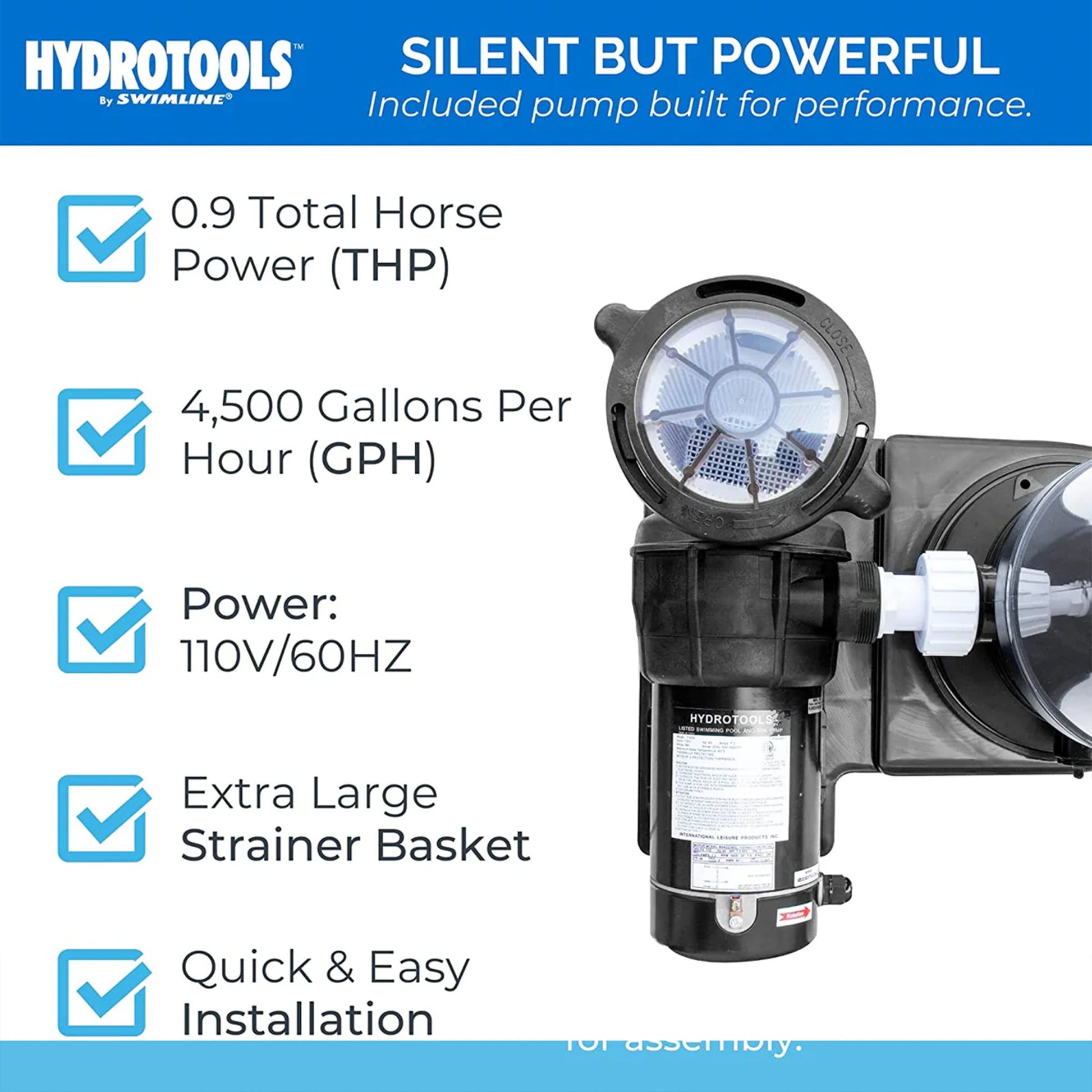 - Equipped with a 0.9 THP pump that circulates up to 4,500 gallons per hour, this system efficiently cleans pools holding up to 19,000 gallons, ensuring crystal-clear water