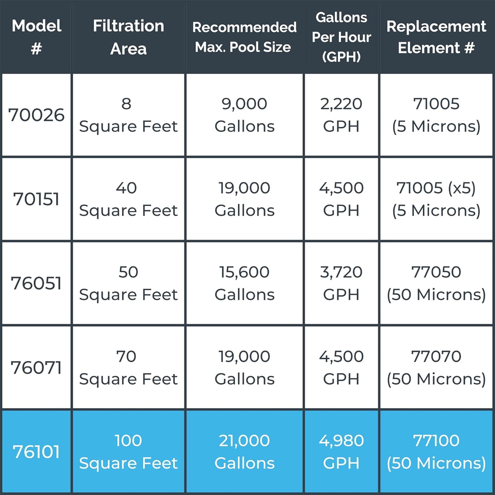 - Equipped with a 100-square-foot filtration area for pools up to 40,000 gallons