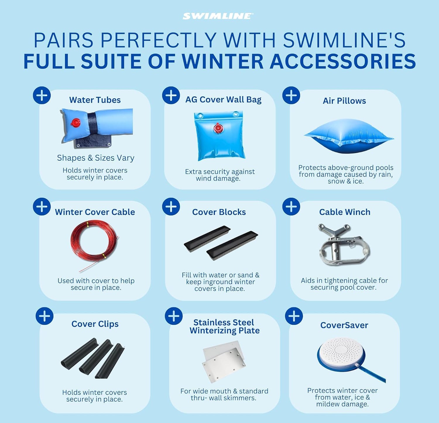 Introducing the SWIMLINE HYDROTOOLS Heavy Duty Pool Covers, your ultimate solution for preserving the quality and longevity of your above-ground swimming pool through the winter season. Designed with the highest standards, our pool covers effectively keep out snow, ice, and debris, ensuring your pool remains in pristine condition, ready for the next swim season.