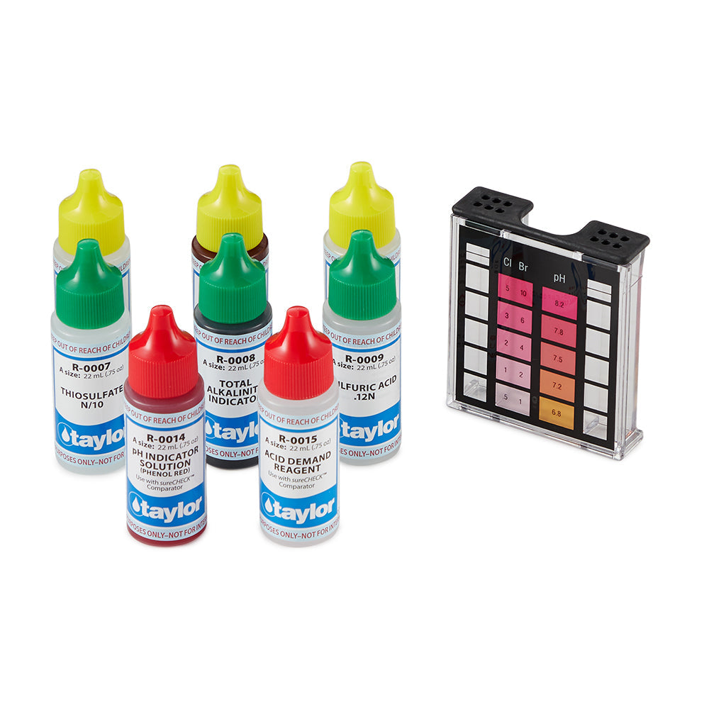 Make sure your pool water is safe and clean for swimmers this season with this Taylor Pool Test Kit. This kit includes tests for free and total chlorine, pH w/acid demand, total alkalinity, and total bromine. This Taylor Pool Test Kit comes with a heavy-duty case, and each solution comes in a .75 oz amount. It's easy and accurate.
