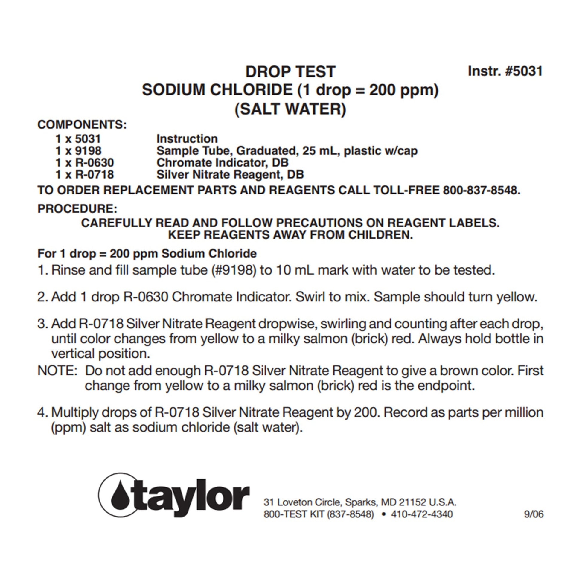Taylor K-1766 Liquid Swimming Pool Spa Sodium Chloride Salt Water Drop Test Kit