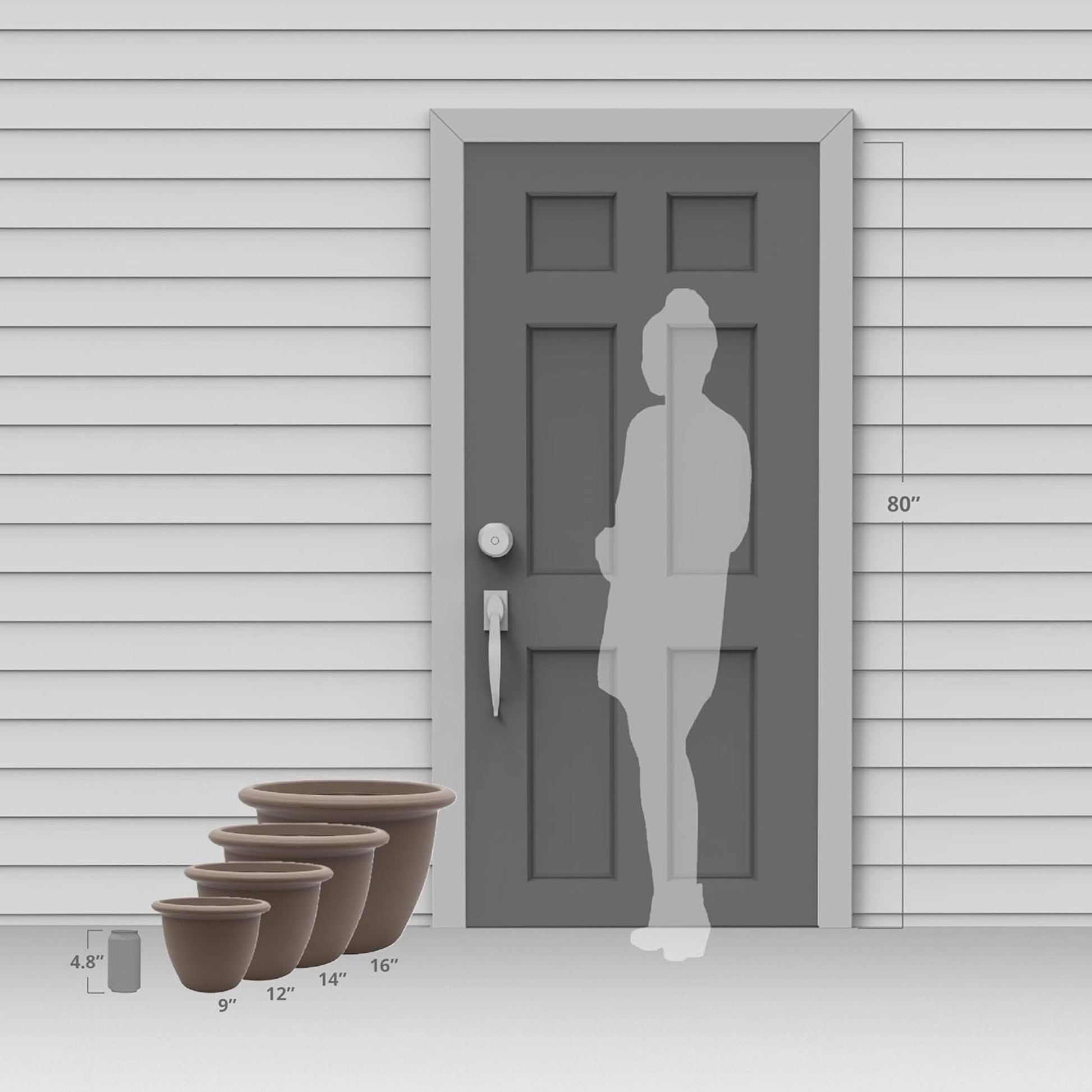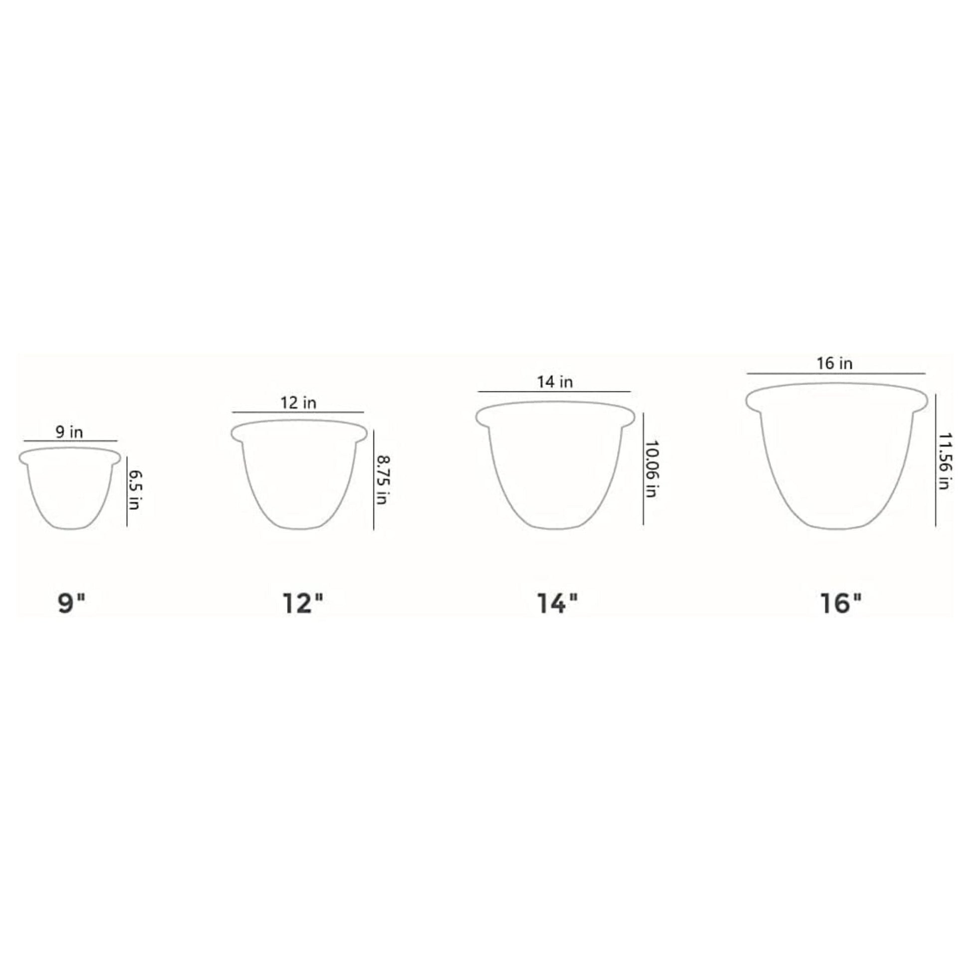 - Round self-watering planter is 12 inches in diameter and crafted from resin that resists weather for a sturdy and lightweight design