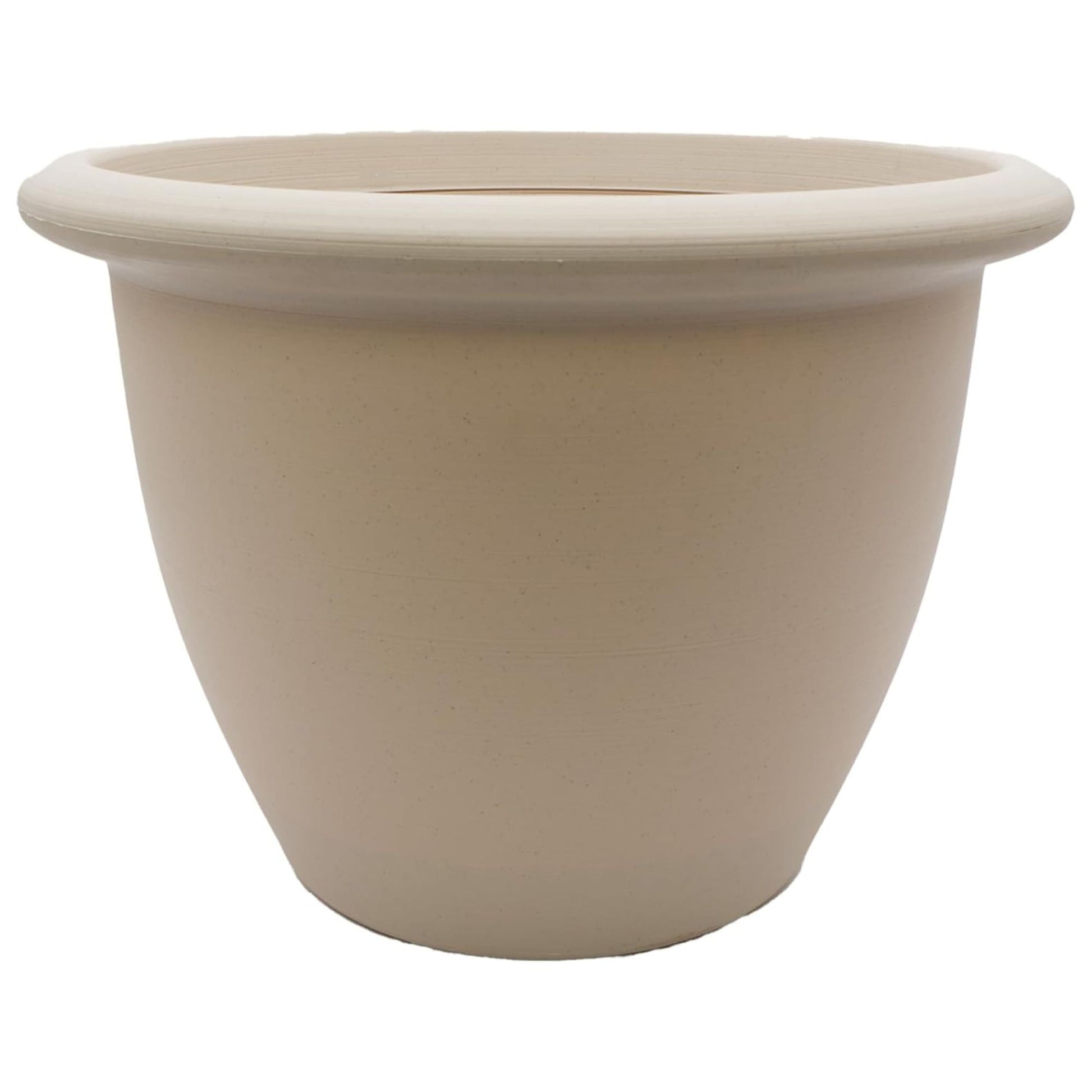 - Round self-watering planter is 14 inches in diameter and crafted from resin that resists weather for a sturdy and lightweight design