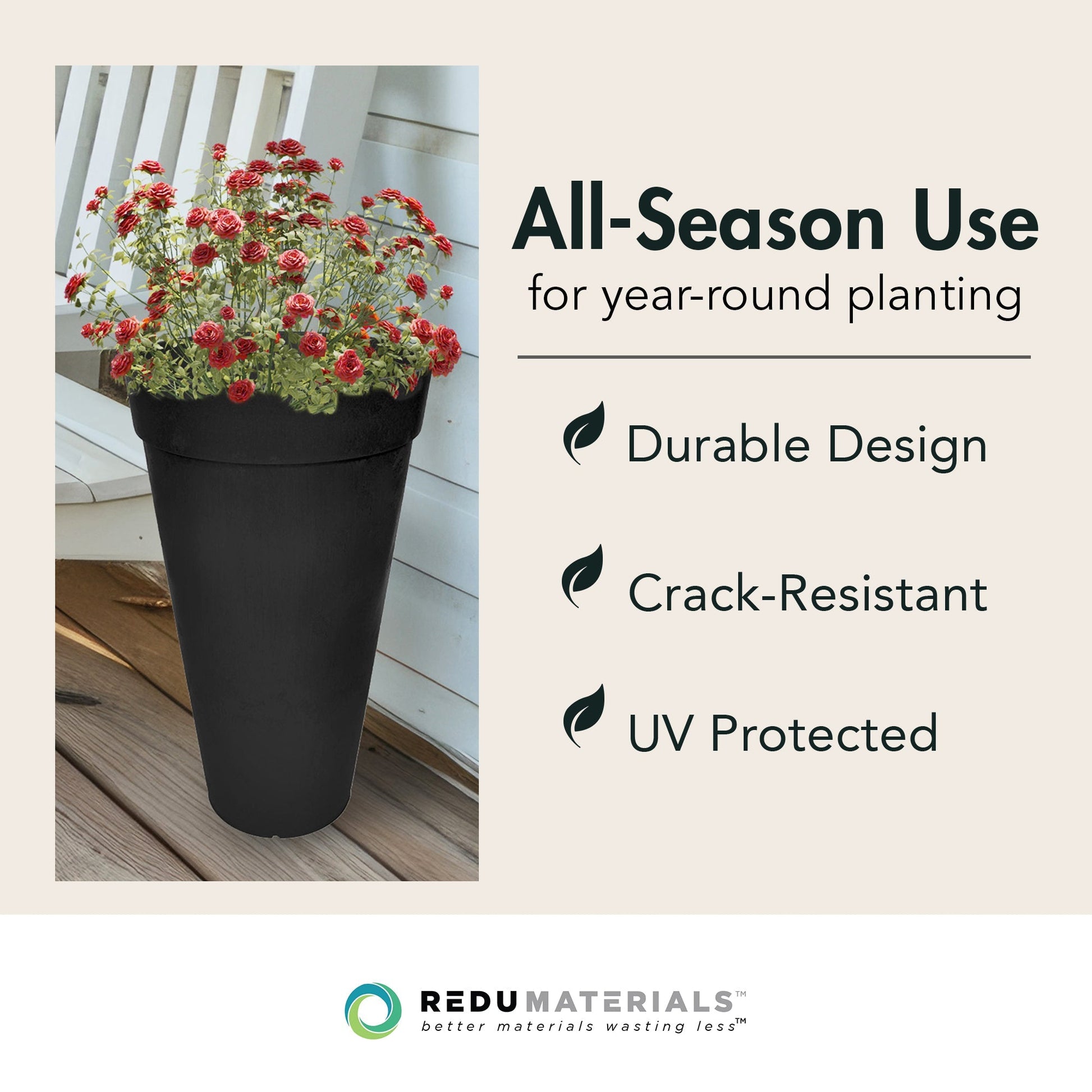 - Made from eco-friendly recycled material, these black planters are crack-proof and recommended for all-season use