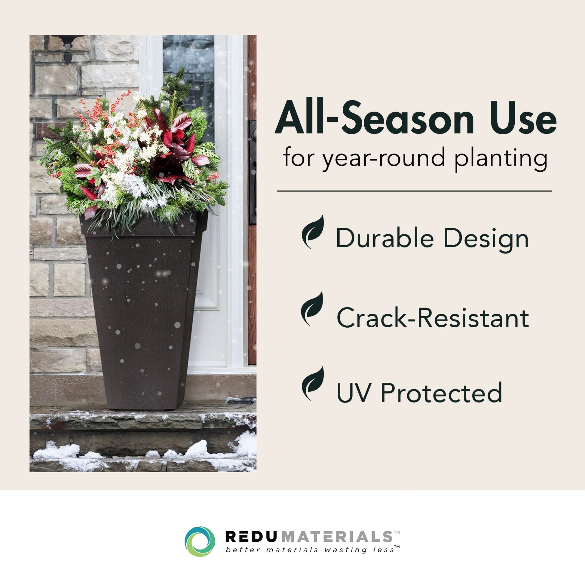 - Made from eco-friendly recycled material, this black planter is crack-proof and recommended for all-season use