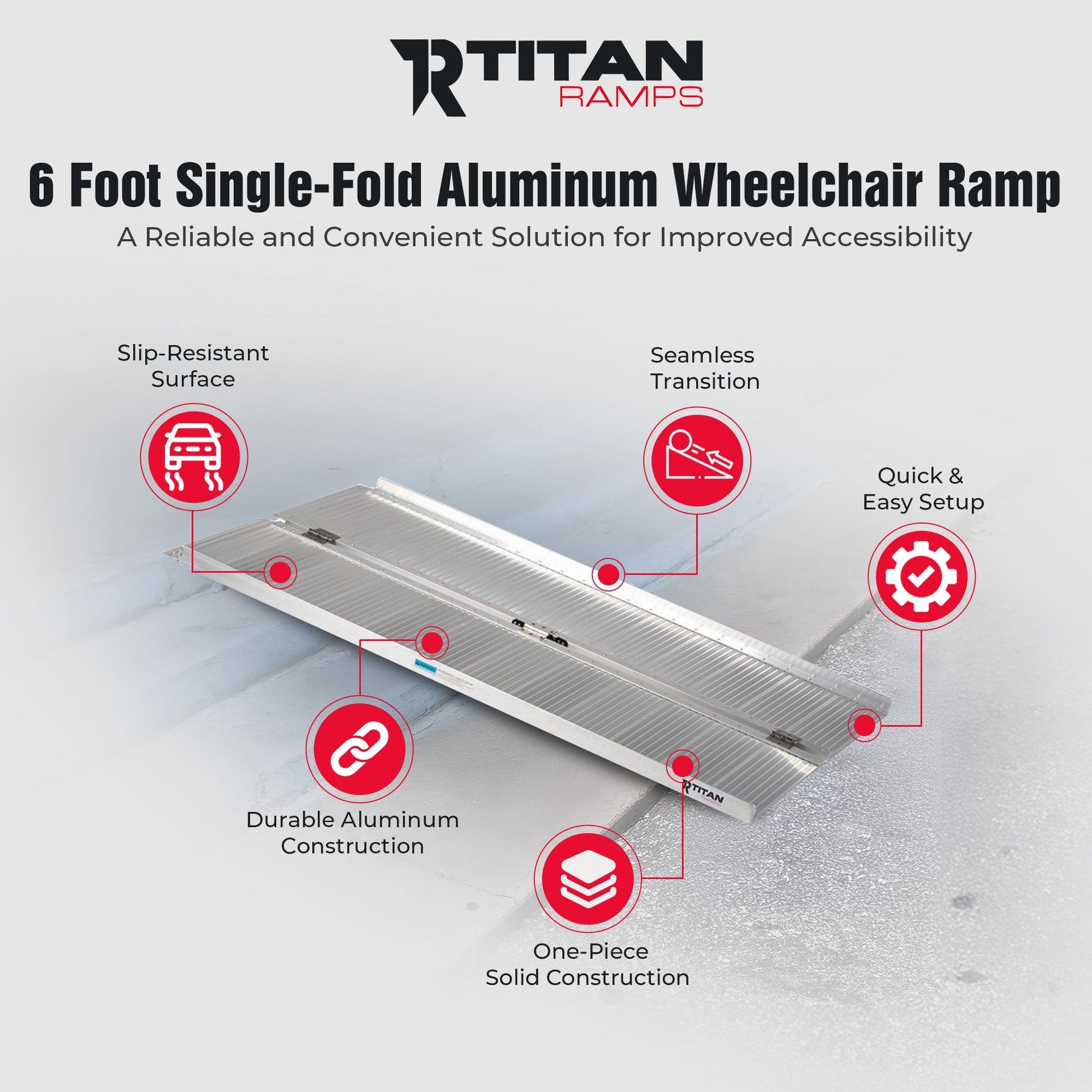 Whether for home entrances, vehicles, or travel, the Titan Ramps 5-Foot Single-Fold Wheelchair Ramp provides strength, reliability, and flexibility to provide every user with safety and independence.