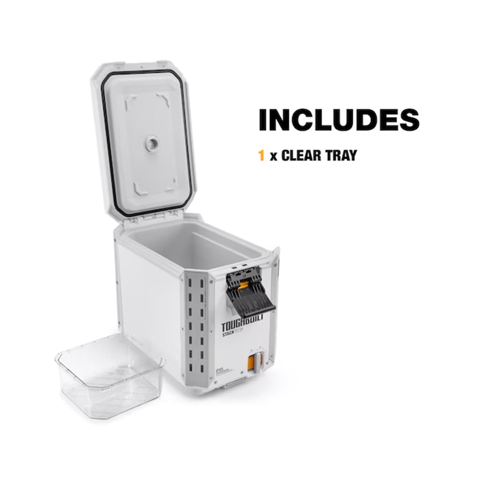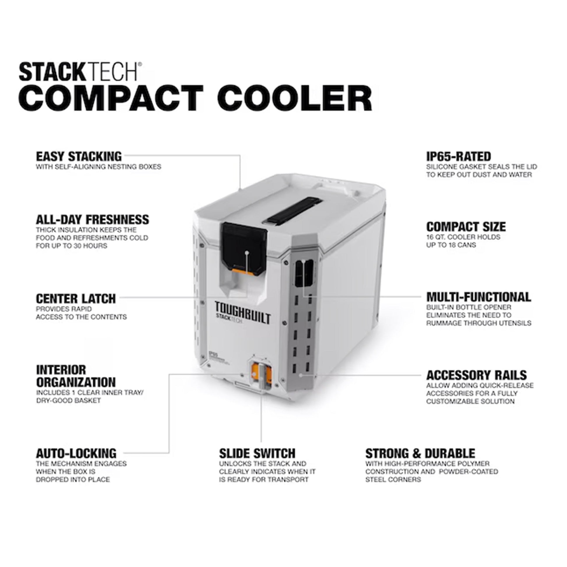 The StackTech Compact Cooler is engineered for those who demand performance and durability. It features an intuitive self-aligning top that allows StackTech boxes and totes to virtually stack themselves. An auto-locking interface ensures the coolers and tool boxes sit securely, lock into place for transport, and easily unlock with the slide of a switch. A prominent lock indicator lets you know your Stack is safe to move without second guessing. Accessing the cooler is simple and intuitive with a one-handed center latch, standard on the StackTech system. The 16-quart capacity provides ample room for your beverages and perishables. Inside the cooler, you'll find a clear tray/dry goods basket, perfect for separating snacks or personal items from the main compartment, and a cutting board that nests inside the cooler for easy meal preparation or can be used as a divider. A built-in bottle opener located on the front accessory rail ensures you're always ready to enjoy your favorite beverages after a TOUGH day, and a convenient drain spout makes cleanup easy. The white color helps to reflect sunlight, reducing heat absorption and keeping the contents cooler for longer. The StackTech coolers are compatible with the ToughBuilt Ice Pack, TB-B1-A-92 (not included), which attaches to the inside of the lid. Full customization is at Pros’ fingertips with tool-free, quick-release steel accessory rails. The StackTech Compact Cooler is built for high-impact durability with armored corners, a steel-reinforced lid, and IP65 dust and water protection to ensure it can handle the toughest conditions. The lockable lid provides security and peace of mind. The StackTech Compact Cooler is engineered for Pros to build a system unlike any other and customize it to the needs of every trade.