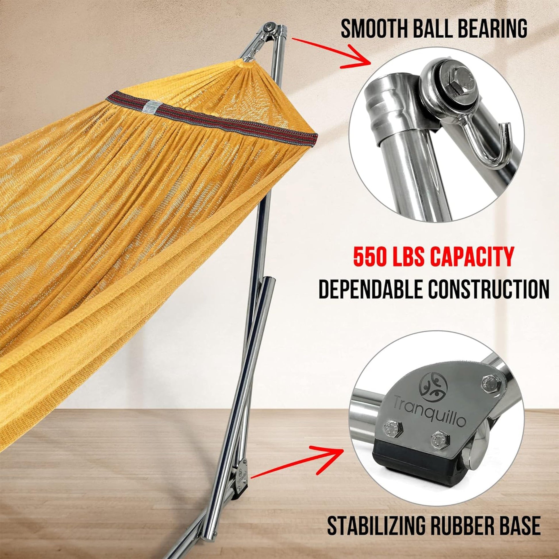 Equipped with 3 height adjustments and smooth ball bearings to ensure all rocking movements are flawless and noiseless, this hammock will satisfy all your relaxation needs. The powder-coated steel frame provides increased durability that supports up to 550 pounds. A carry bag is included to conveniently store and transport the hammock stand and net so you can quickly set it up on your next camping adventure or in your home when the time is right.