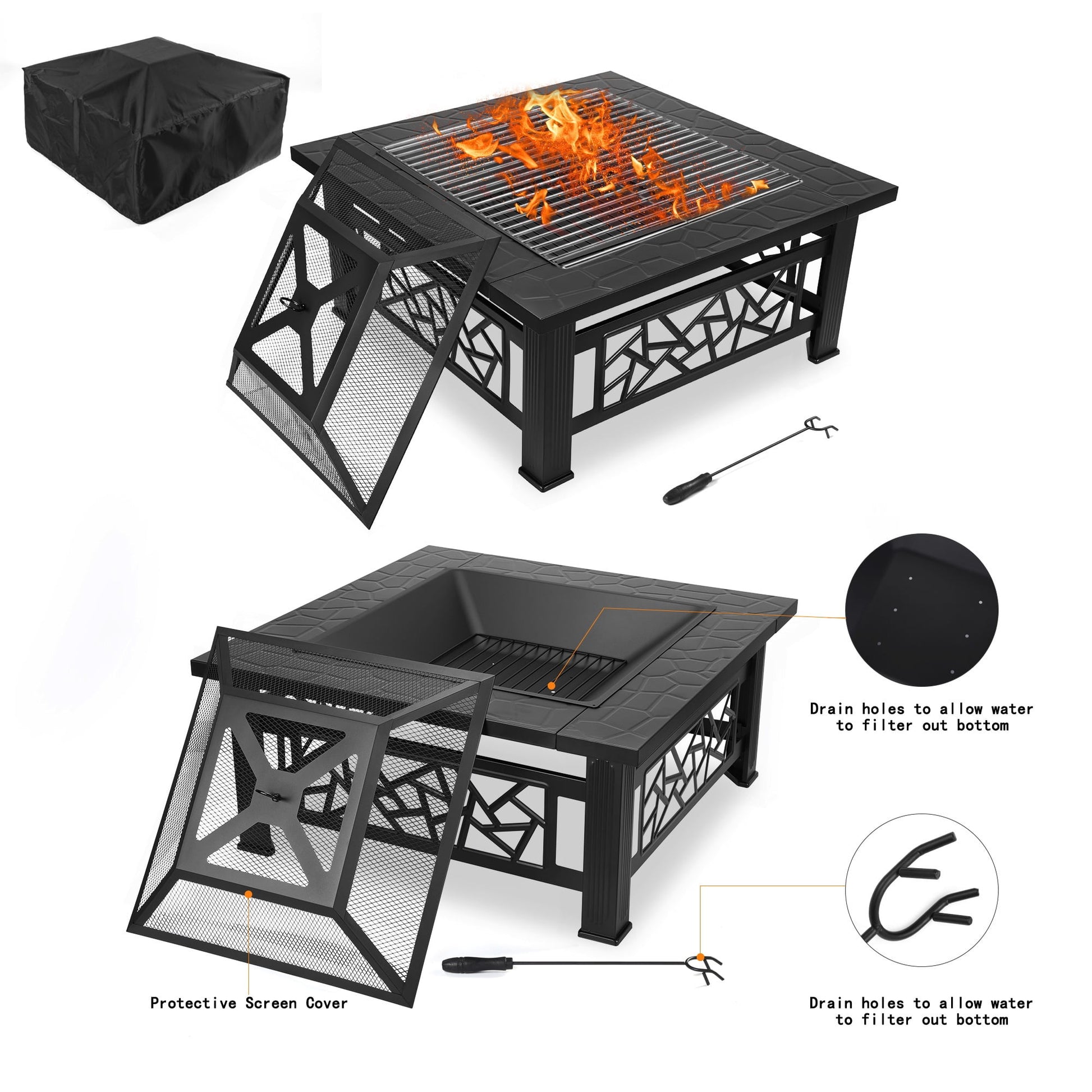 UHOMEPRO 32"" Square Fire Pit Table is a premium outdoor heating solution designed to elevate your backyard, patio, or camping experience. Combining functionality and modern aesthetics, this versatile fire pit features a durable metal construction with a heat-resistant black finish, ensuring long-lasting performance. Its spacious 32"" square design provides ample room for wood-burning fires while doubling as a stylish table for social gatherings. The included grill grate transforms into a BBQ station, perfect for cooking outdoor meals. Safety and convenience are prioritized with a removable mesh spark screen to contain embers and a poker for easy fire management. A weatherproof cover is included for year-round protection. Unlike many compact fire pits, this fire pit tables offers superior heating capacity for larger groups, making it ideal for entertaining.