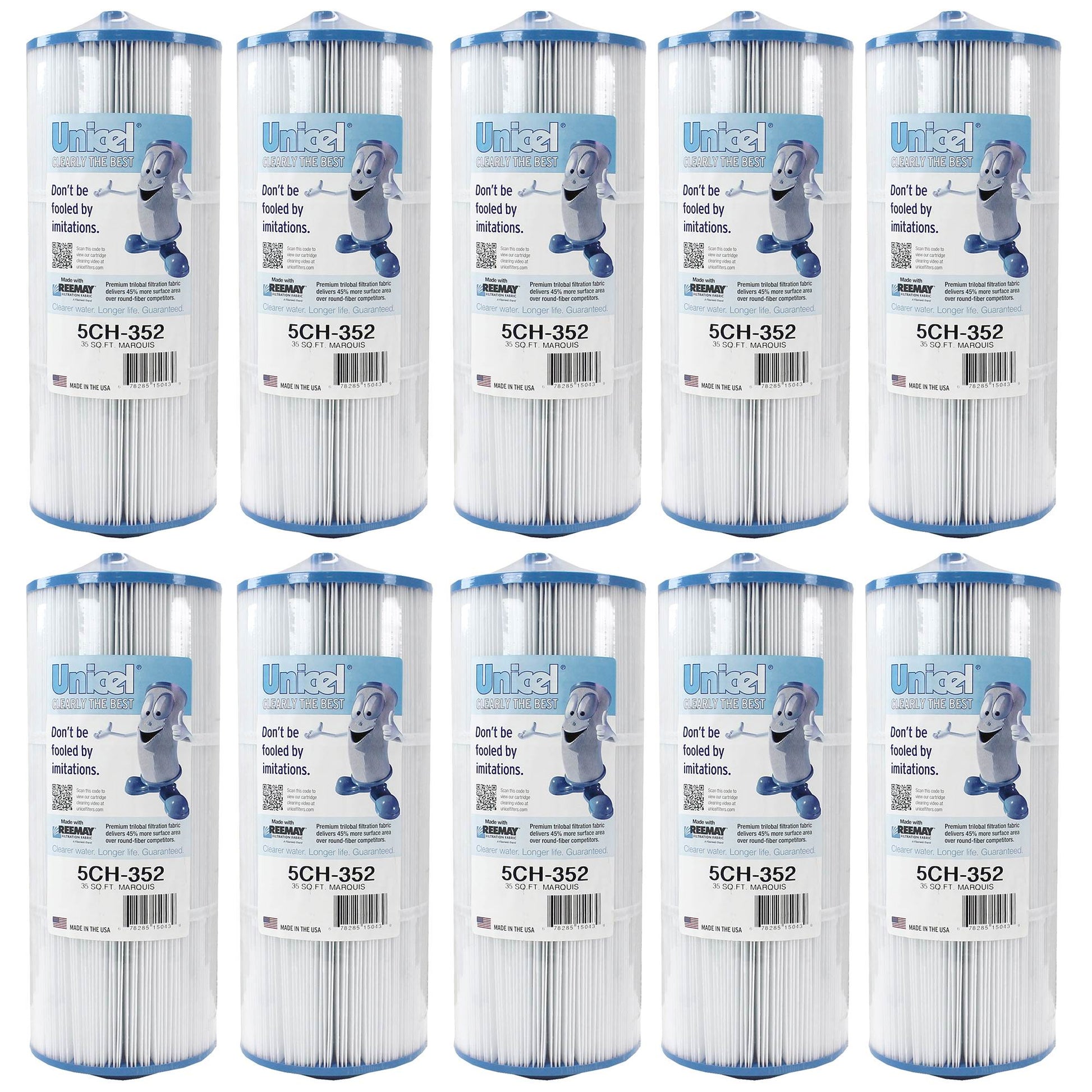Featuring 35 square feet of 3-ounce basis weight media made of 100-percent polyester Reemay material, this 10-pack of Unicel 5CH-352 Cartridge Filters for Hot Tubs ensures high performance and dependable filtration over time. The uniform pleats and Reemay media deliver higher dirt-holding capacity and more time between cleanings. Plus, the smooth surface of the media makes it easy to maintain, resists degradation from chemicals, stands strong under pressure, and holds up to the rigors of multiple cleanings.