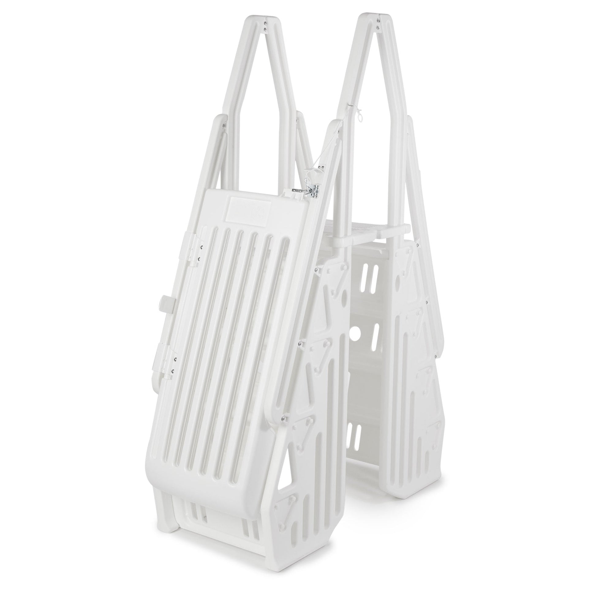 Featuring a plastic resin construction with stainless steel hardware, this ultra-stable ladder provides ultimate safety for all swimmers. Built with 2 deck mount flanges for greater stability, full step entry, and double handrails, this ladder is made for pools up to 4.5-foot side walls and a flat bottom. The latching gate securely closes and locks when the pool is not in use to prevent unwanted activity and injuries.