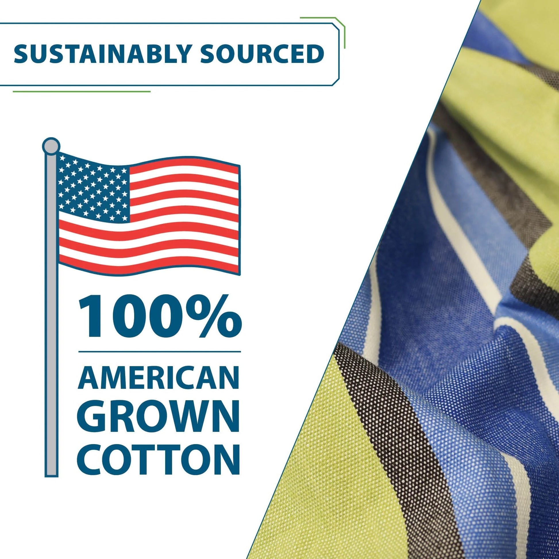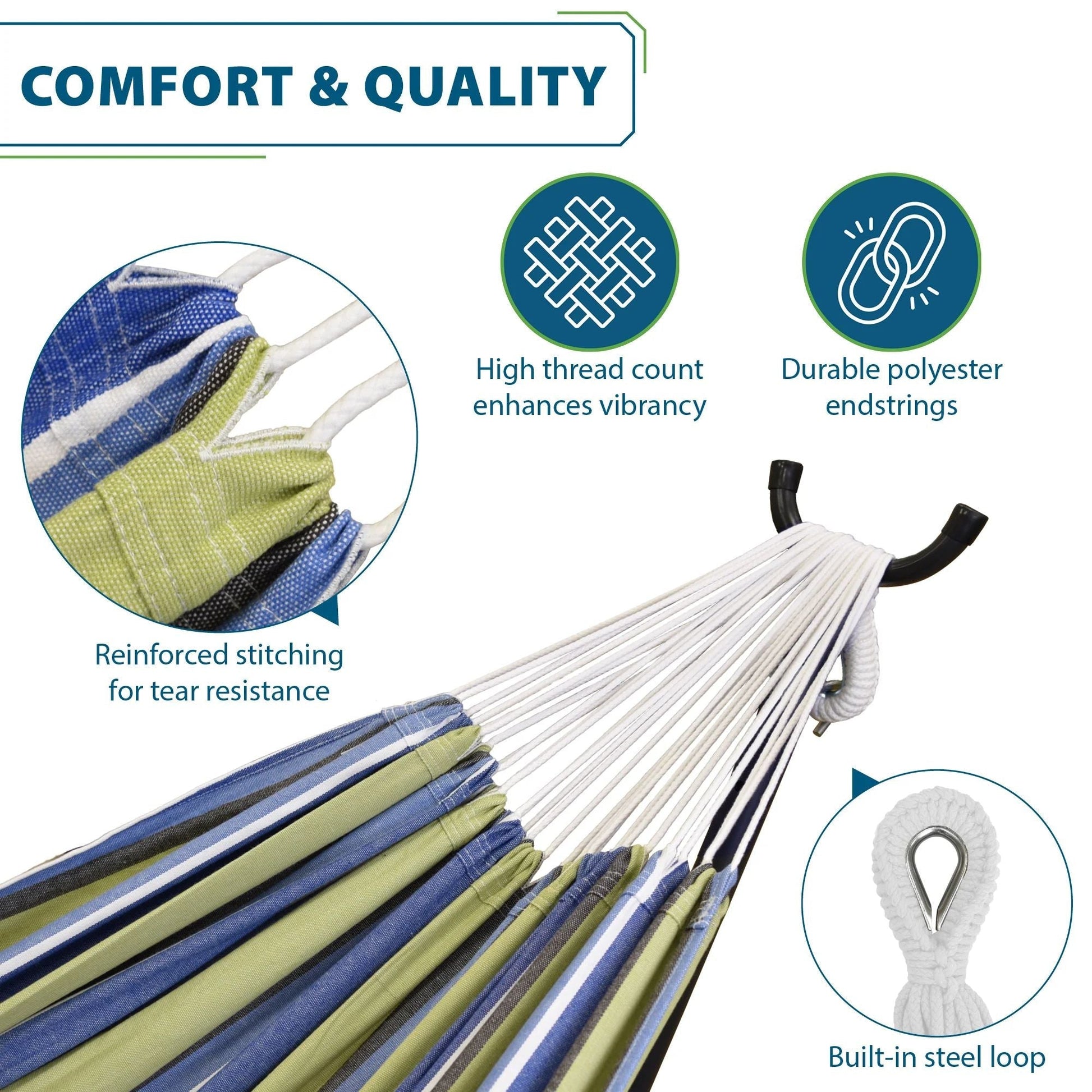 Unwind in ultimate comfort wherever you go with this Cozy Double Hammock and Heavy-Duty 9-Foot Steel Stand—your perfect partner for effortless outdoor relaxation. Made from 100% USA-sourced cotton, this hammock delivers a breathable, soft feel ideal for sunny afternoons or evening lounging. With an impressively spacious 63" x 94" bed and a total length of 130 inches, it comfortably accommodates two adults, making it perfect for sharing or relaxing solo.