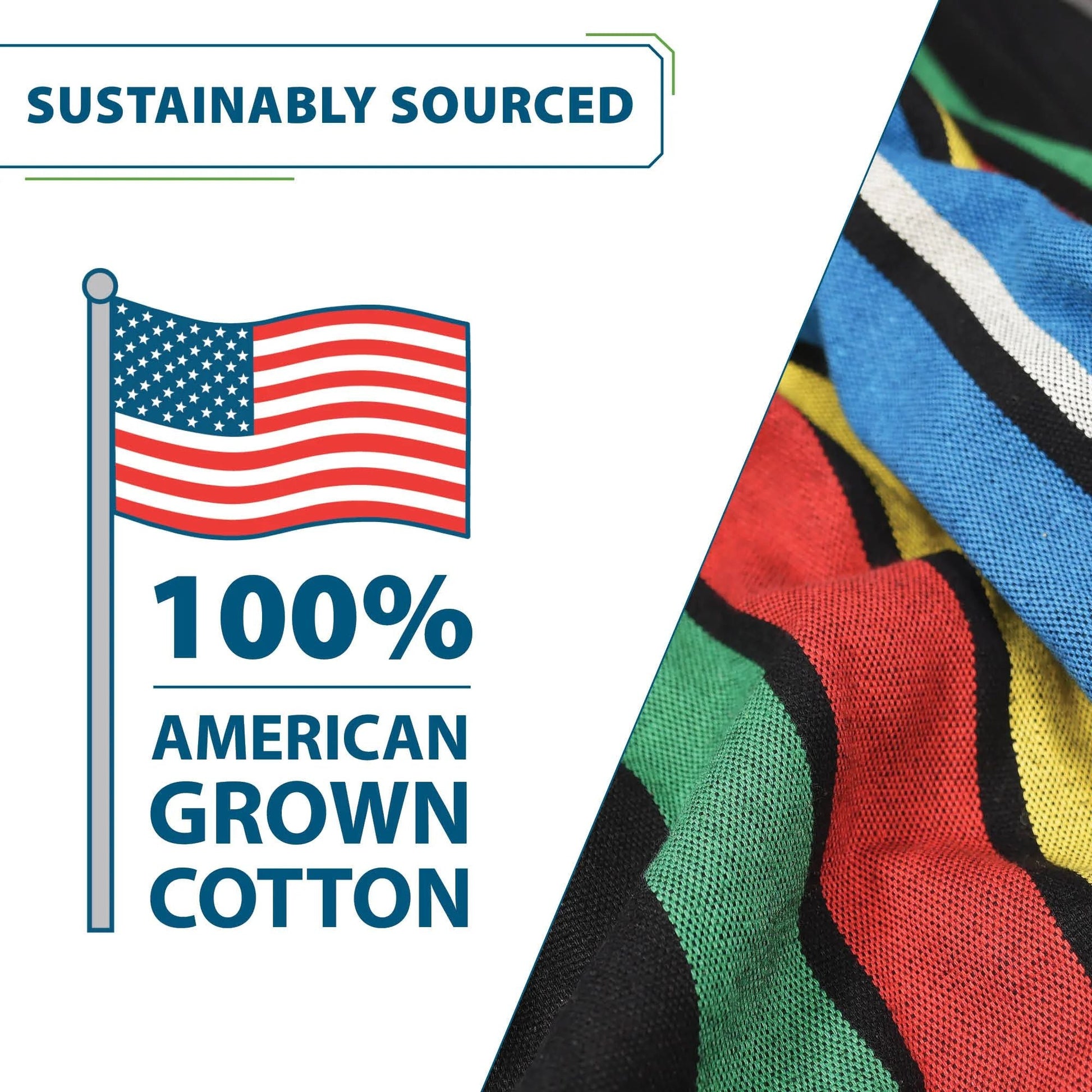 Unwind in ultimate comfort wherever you go with this Cozy Double Hammock and Heavy-Duty 9-Foot Steel Stand—your perfect partner for effortless outdoor relaxation. Made from 100% USA-sourced cotton, this hammock delivers a breathable, soft feel ideal for sunny afternoons or evening lounging. With an impressively spacious 63" x 94" bed and a total length of 130 inches, it comfortably accommodates two adults, making it perfect for sharing or relaxing solo.