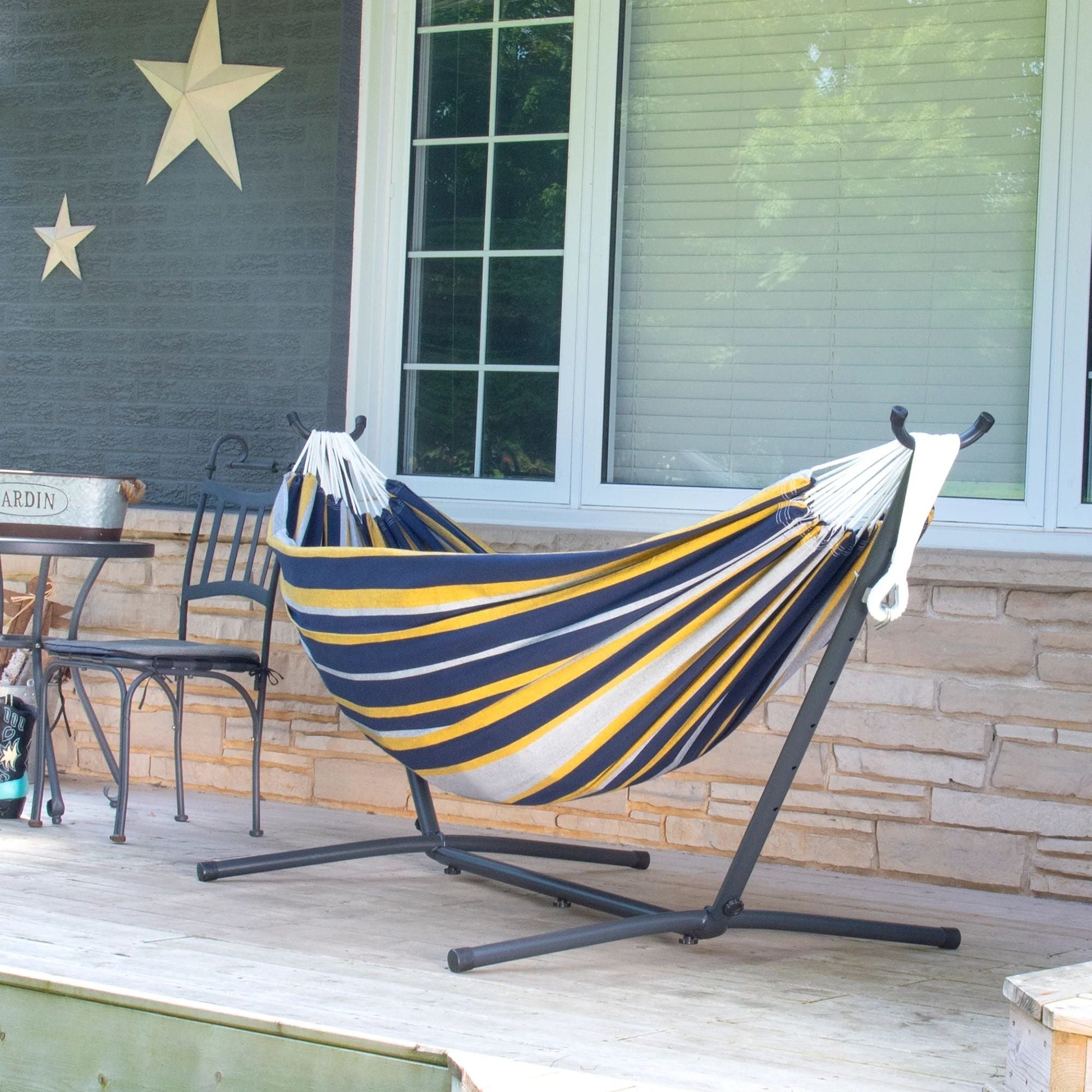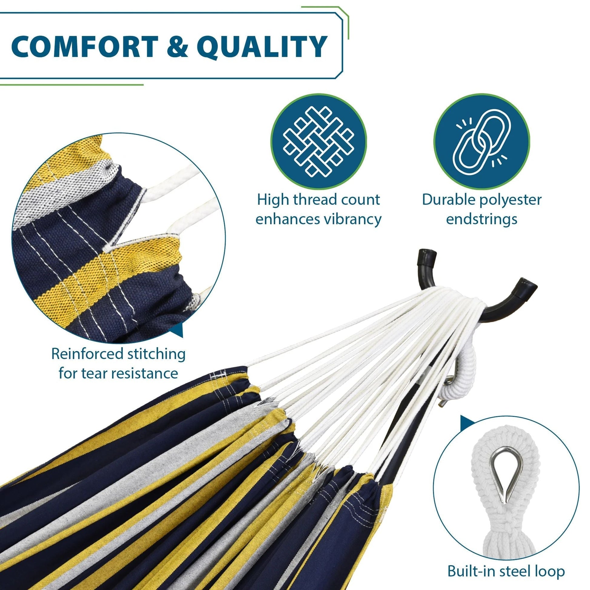 Unwind in ultimate comfort wherever you go with this Cozy Double Hammock and Heavy-Duty 9-Foot Steel Stand—your perfect partner for effortless outdoor relaxation. Made from 100% USA-sourced cotton, this hammock delivers a breathable, soft feel ideal for sunny afternoons or evening lounging. With an impressively spacious 63" x 94" bed and a total length of 130 inches, it comfortably accommodates two adults, making it perfect for sharing or relaxing solo.