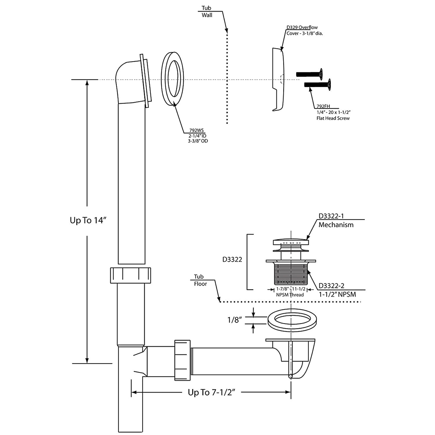 - Washers snugly seal to a variety of angled overflows; fits standard tubs with a 14-inch rough-in