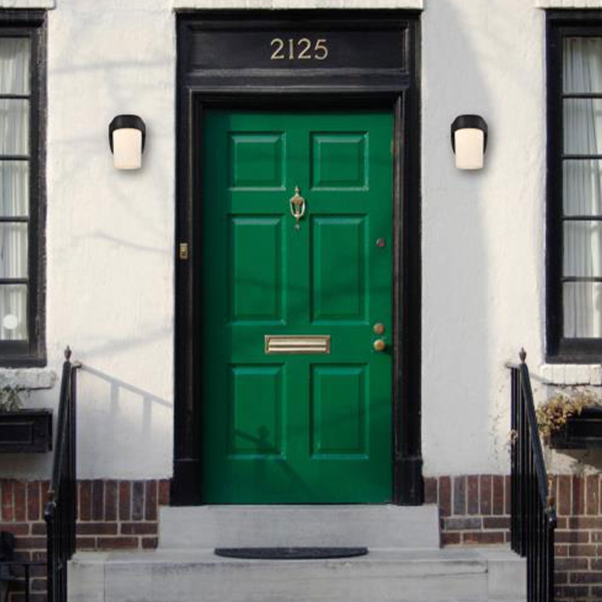 - Features a sleek black finish and frosted opal glass that adds a modern, elegant touch to any outdoor space while complementing a variety of home styles and decors