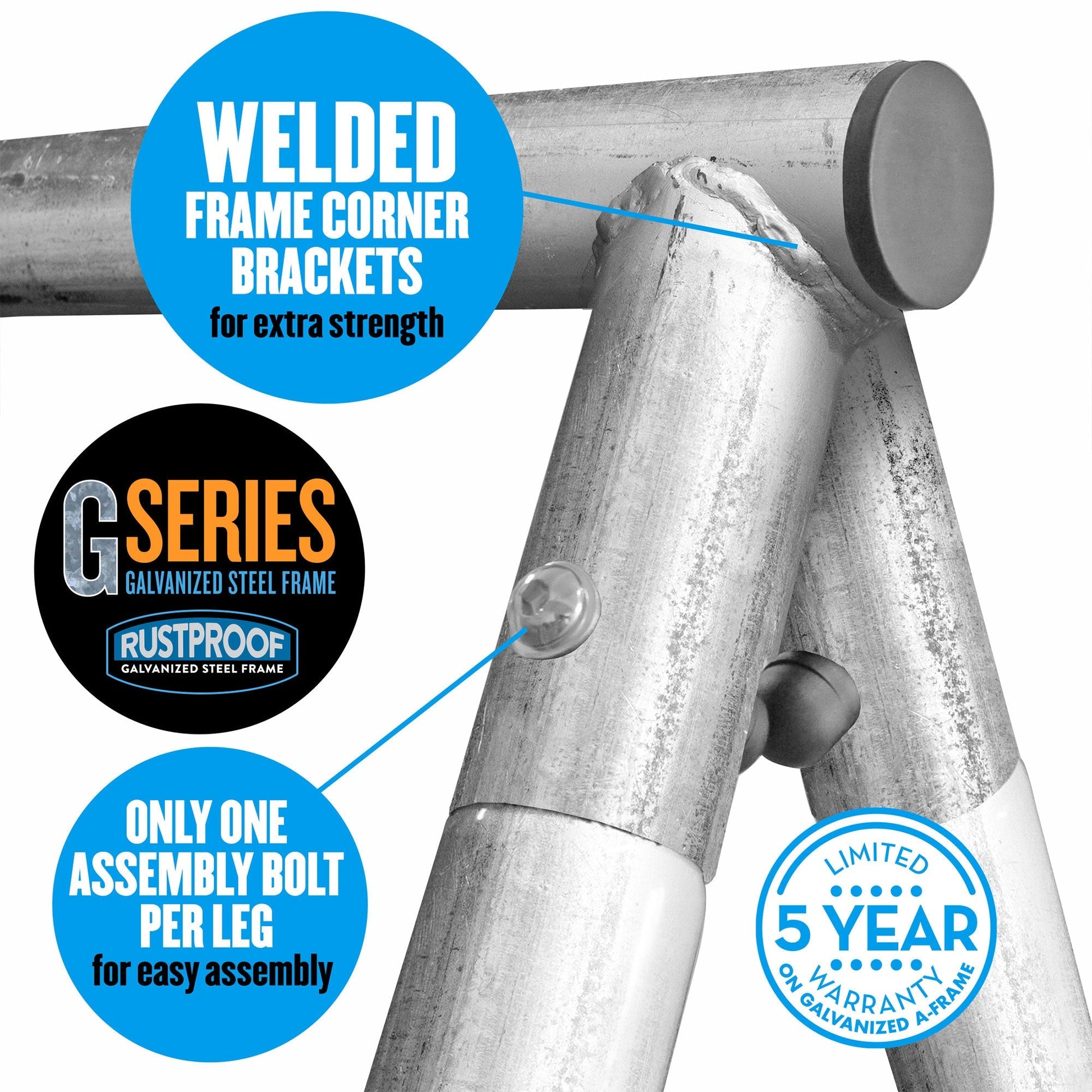 - Made from a galvanized g-series steel frame with welded corner brackets and foam-padded legs for safety and long-lasting durability