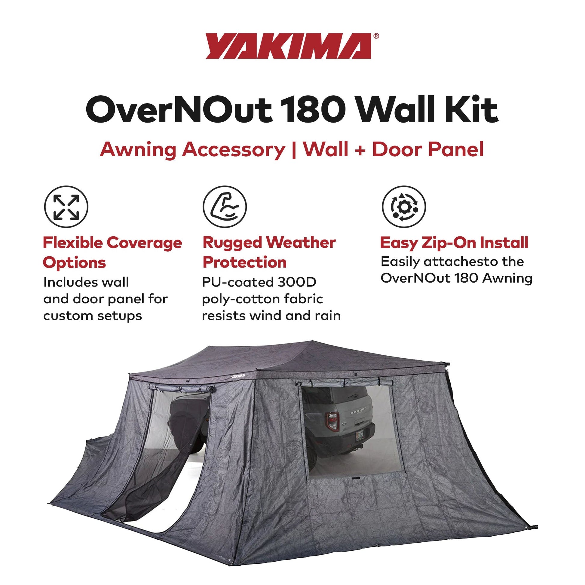 - Wall and door panels zip onto any section of the Yakima OverNOut 180 Awning for added privacy and protection from sun, wind, and rain